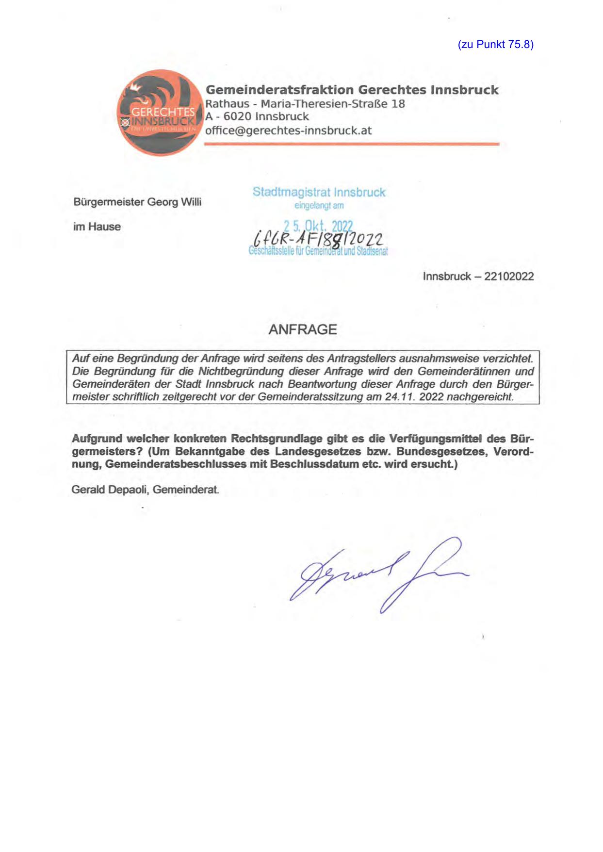 Gemeinderäten der Stadt Innsbruck nach Beantwortung dieser Anfrage durch den Bürgermeister schriftlich zeitgerecht vor der Gemeinderatssitzung am 24. 11. 2022 nachgereicht.