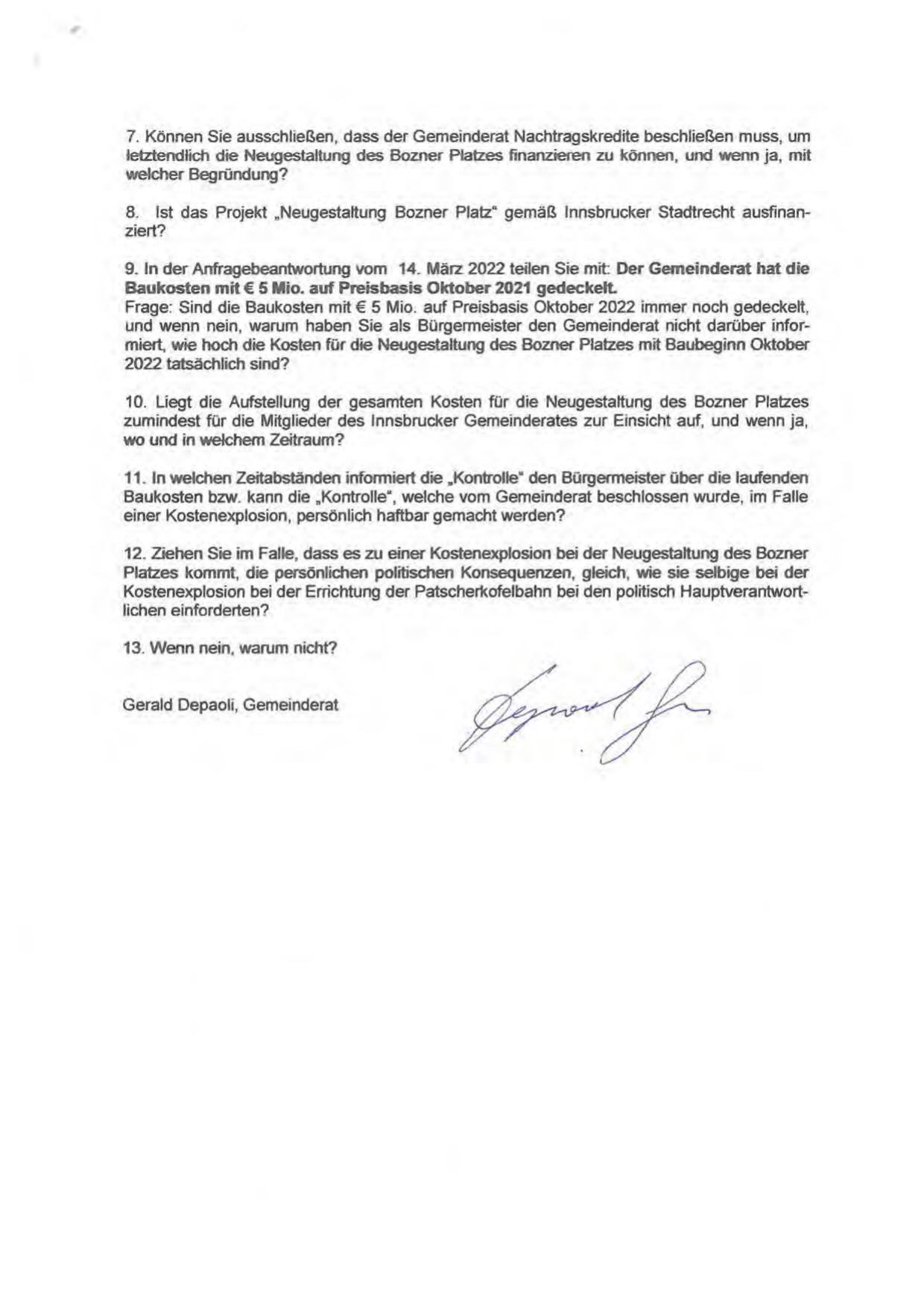 und wenn nein, warum haben Sie als Bürgenneister den Gemeinderat nicht darüber informiert, wie hoch die Kosten für die Neugestaltung des Bozner Platzes mit Baubeginn Oktober