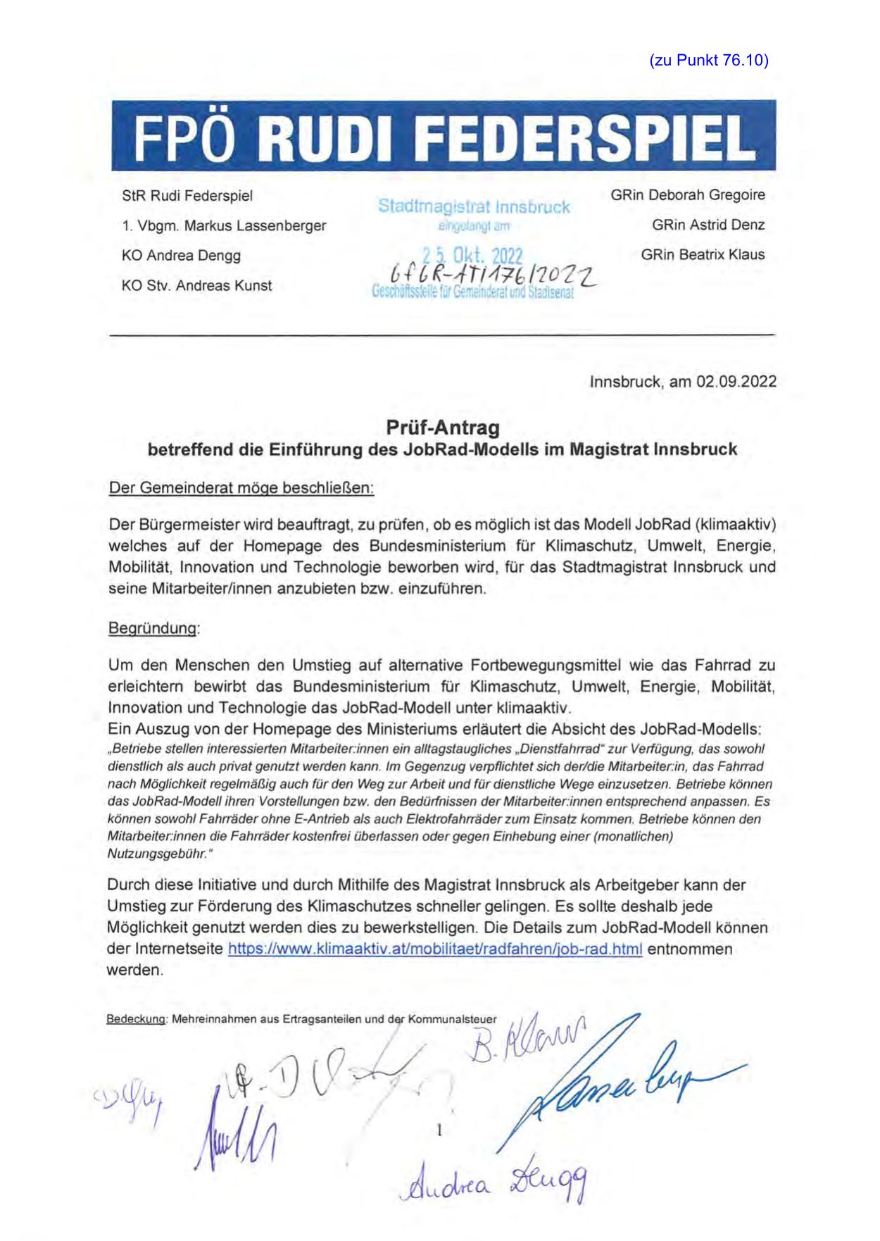 betreffend die Einführung des JobRad-Modells im Magistrat Innsbruck