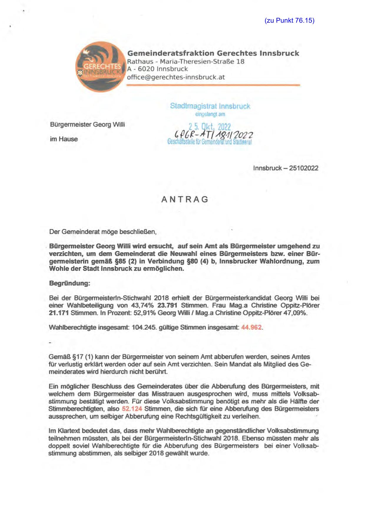 Bürgenneister Georg Willi wird ersucht, auf sein Amt als Bürgenneister umgehend zu