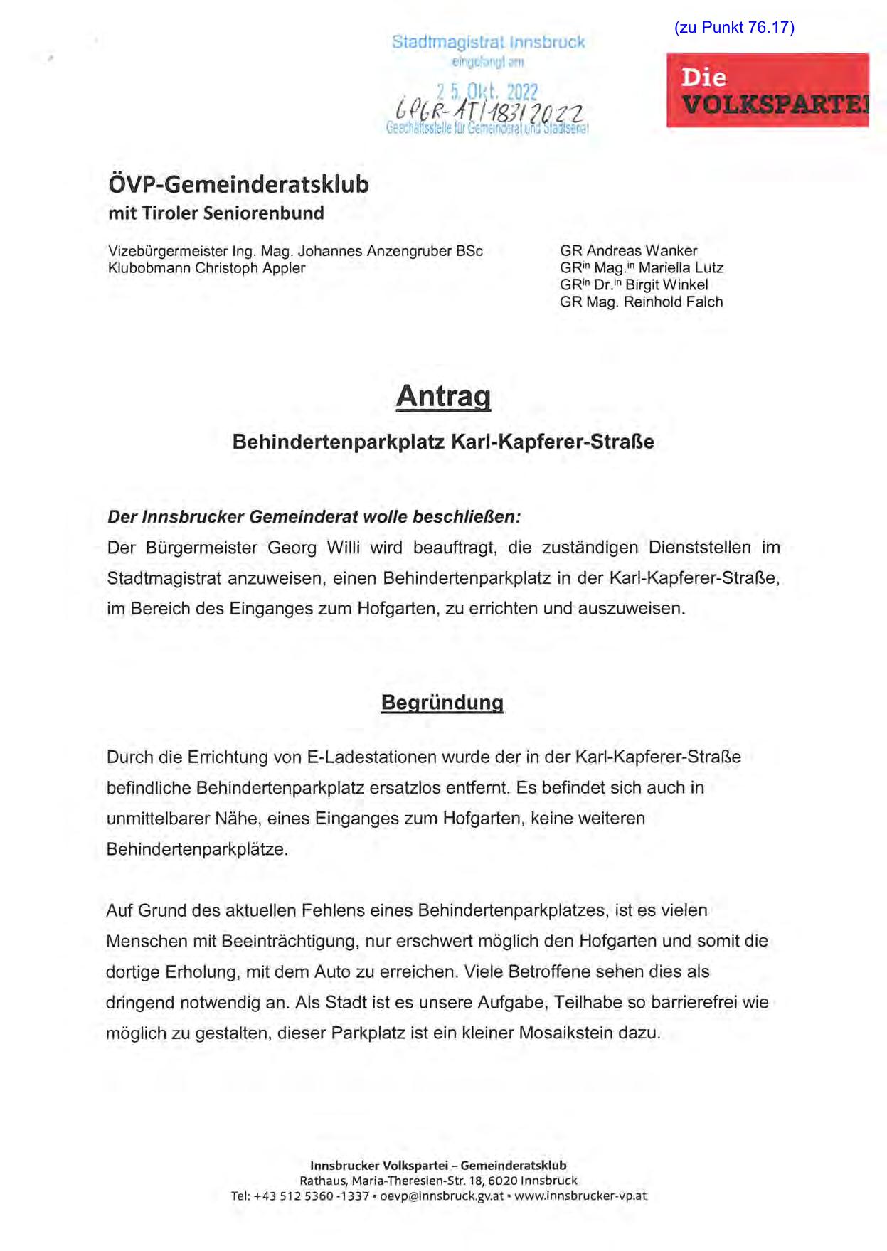 Stadtmagistrat anzuweisen, einen Behindertenparkplatz in der Karl-Kapferer-Straße,