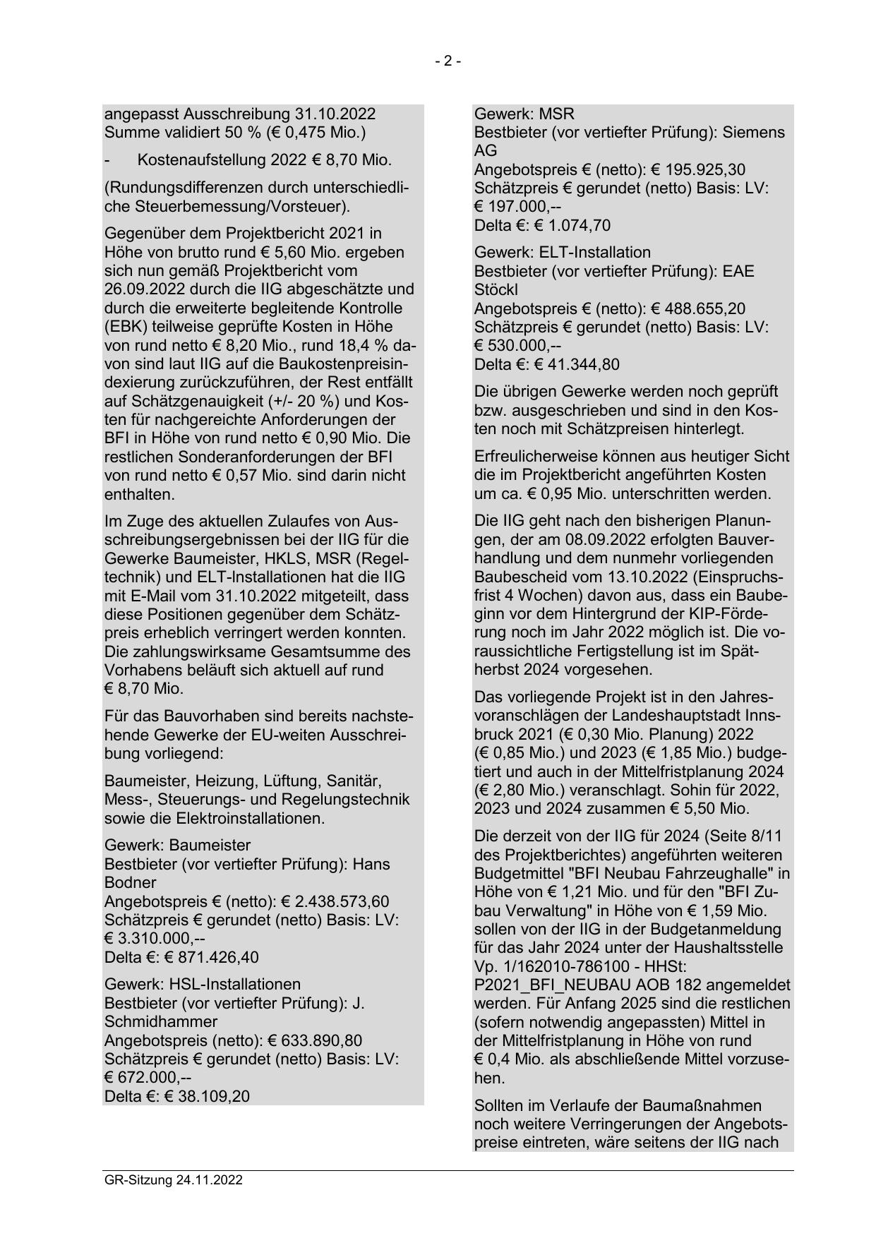 Höhe von € 1,21 Mio. und für den "BFI Zubau Verwaltung" in Höhe von € 1,59 Mio.