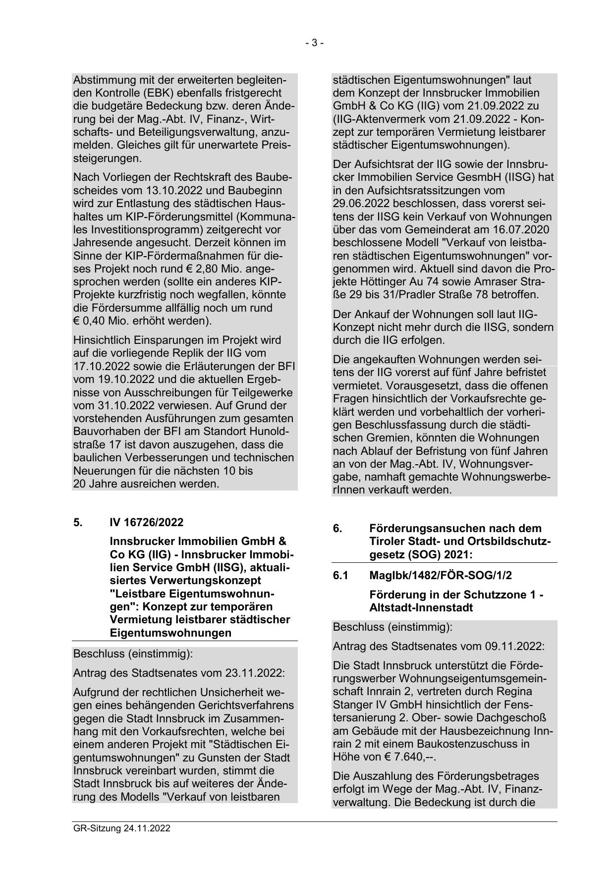 29.06.2022 beschlossen, dass vorerst seitens der IISG kein Verkauf von Wohnungen