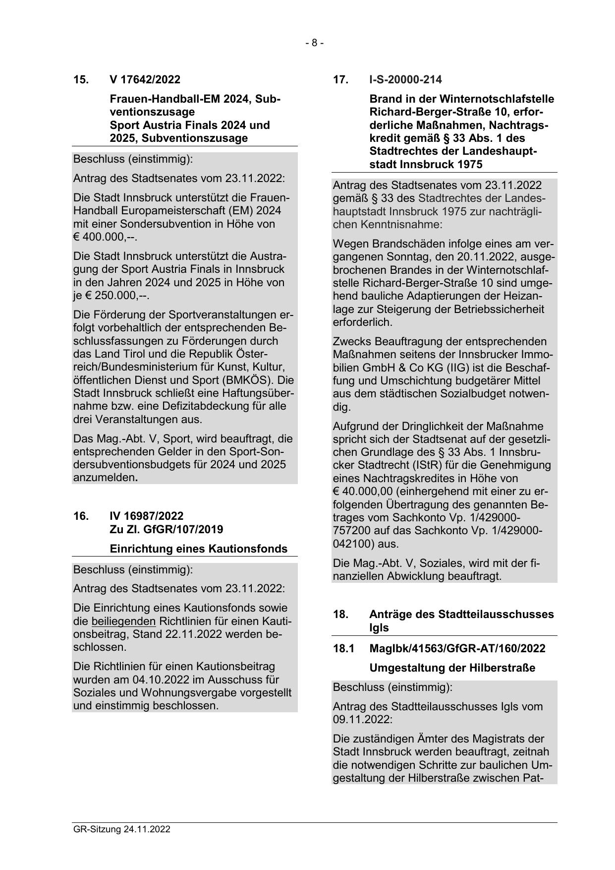 gemäß § 33 des Stadtrechtes der Landeshauptstadt Innsbruck 1975 zur nachträglichen Kenntnisnahme: