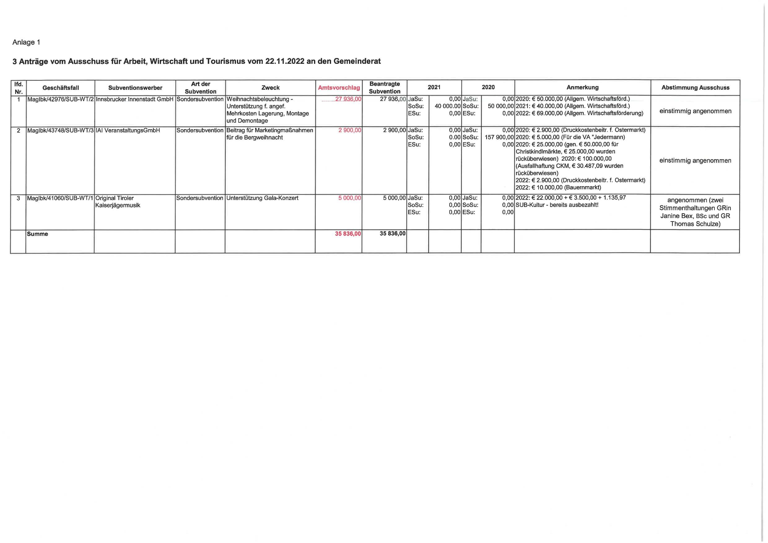 1 Maglbk/42976/SUB-WT/2 lnnsbrucker Innenstadt GmbH Sondersubvention Weihnachtsbeleuchtung Unterstützung f. angef.