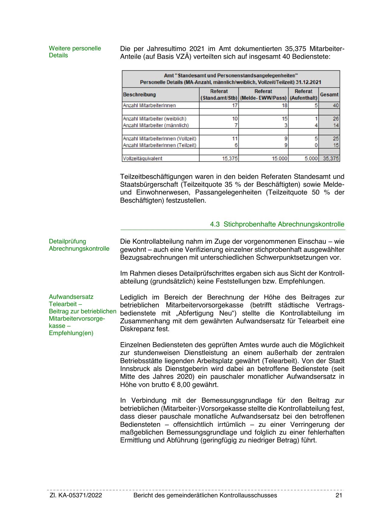 Die per Jahresultimo 2021 im Amt dokumentierten 35,375 MitarbeiterAnteile (auf Basis VZÄ) verteilten sich auf insgesamt 40 Bedienstete: