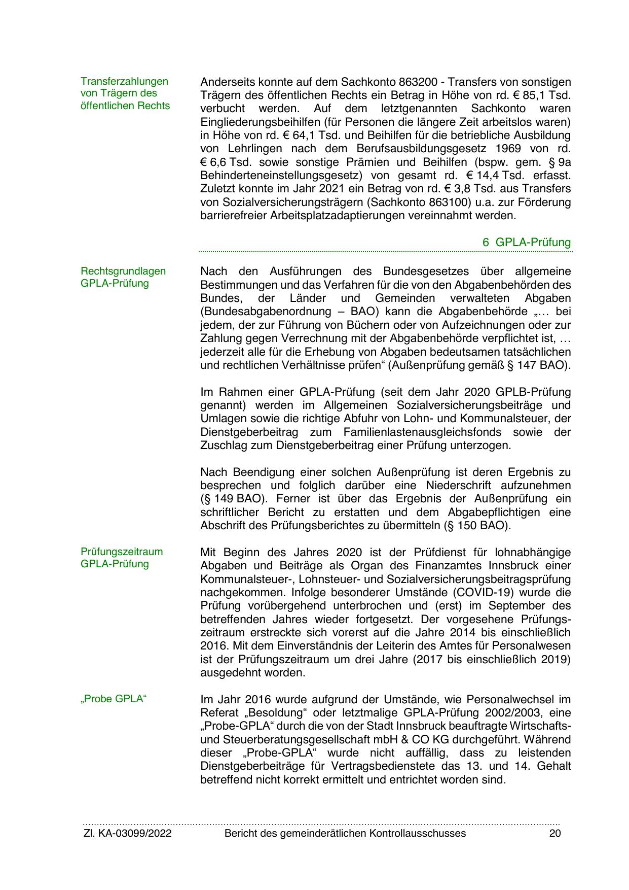 „Probe-GPLA“ durch die von der Stadt Innsbruck beauftragte Wirtschaftsund Steuerberatungsgesellschaft mbH & CO KG durchgeführt. Während