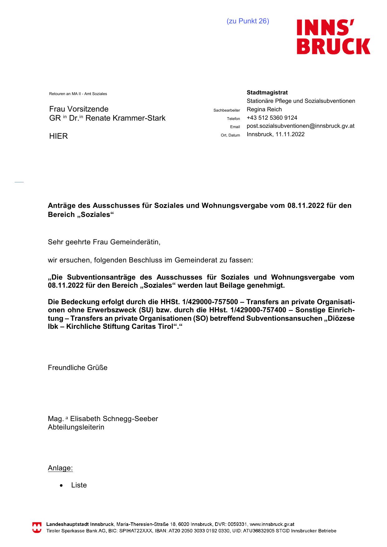 08.11.2022 für den Bereich „Soziales“ werden laut Beilage genehmigt.