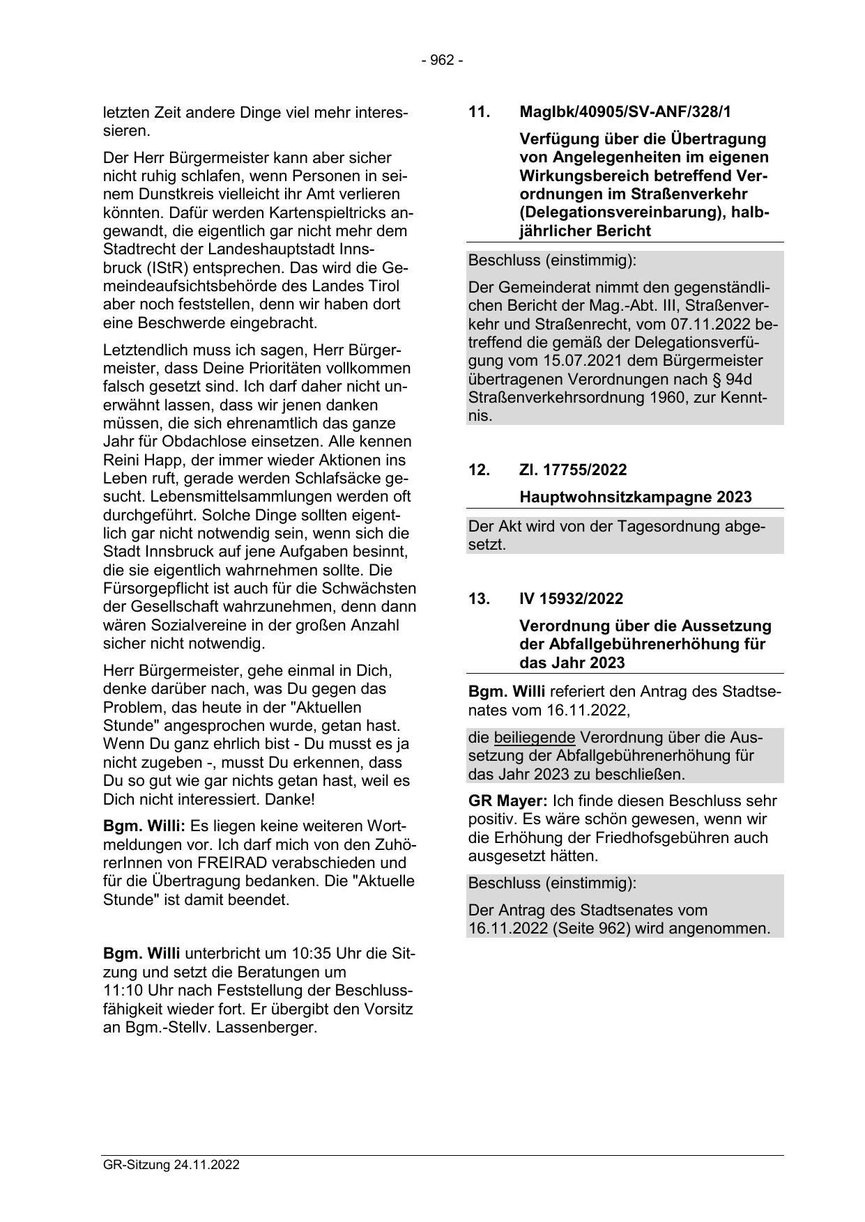 Bgm. Willi: Es liegen keine weiteren Wortmeldungen vor. Ich darf mich von den ZuhörerInnen von FREIRAD verabschieden und