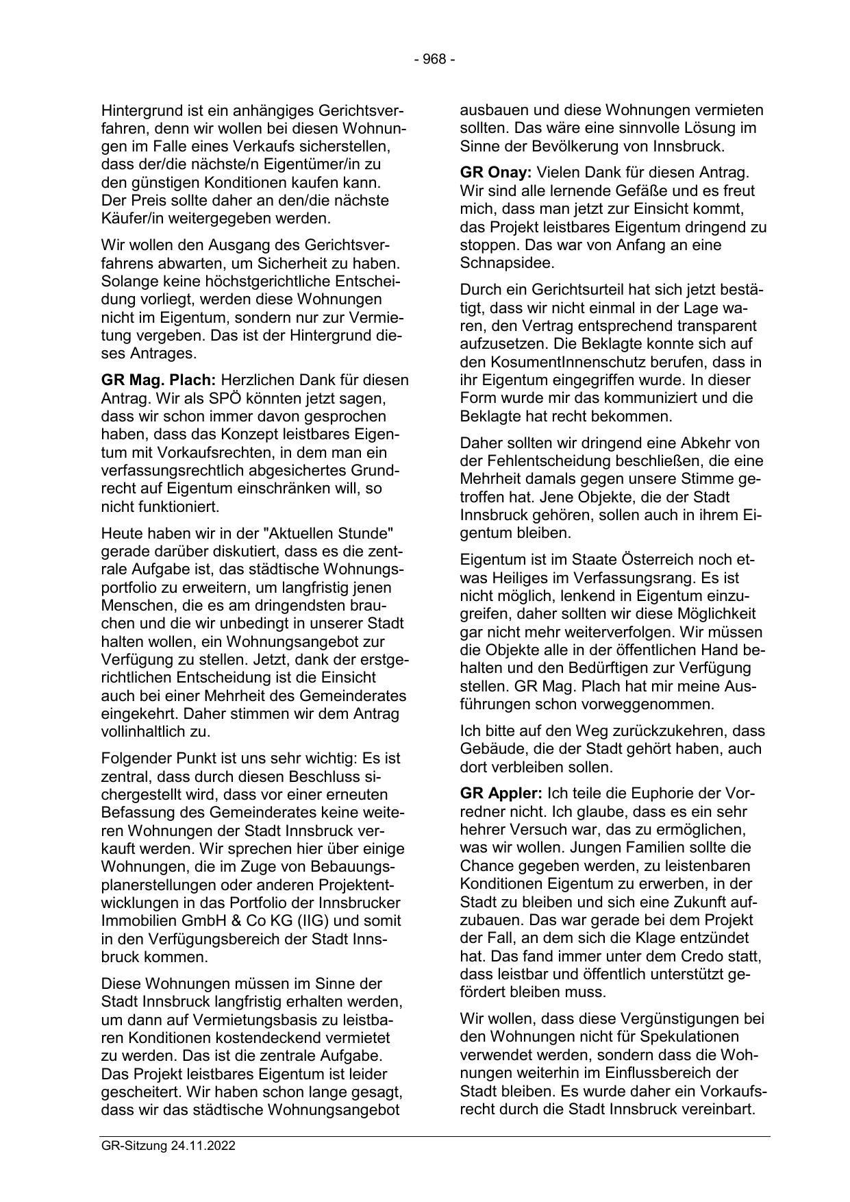 Befassung des Gemeinderates keine weiteren Wohnungen der Stadt Innsbruck verkauft werden. Wir sprechen hier über einige