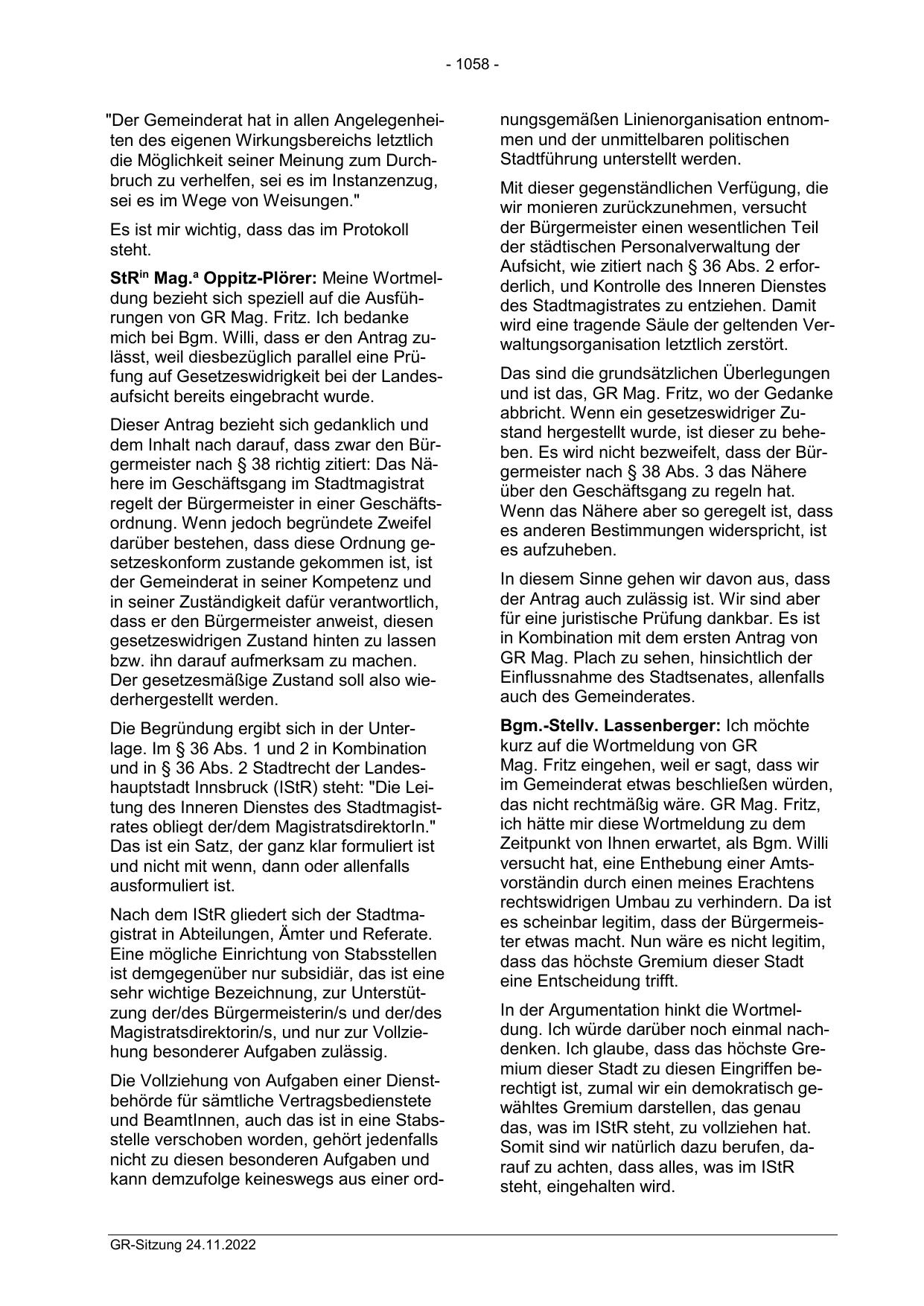 und in § 36 Abs. 2 Stadtrecht der Landeshauptstadt Innsbruck (IStR) steht: "Die Leitung des Inneren Dienstes des Stadtmagistrates obliegt der/dem MagistratsdirektorIn."