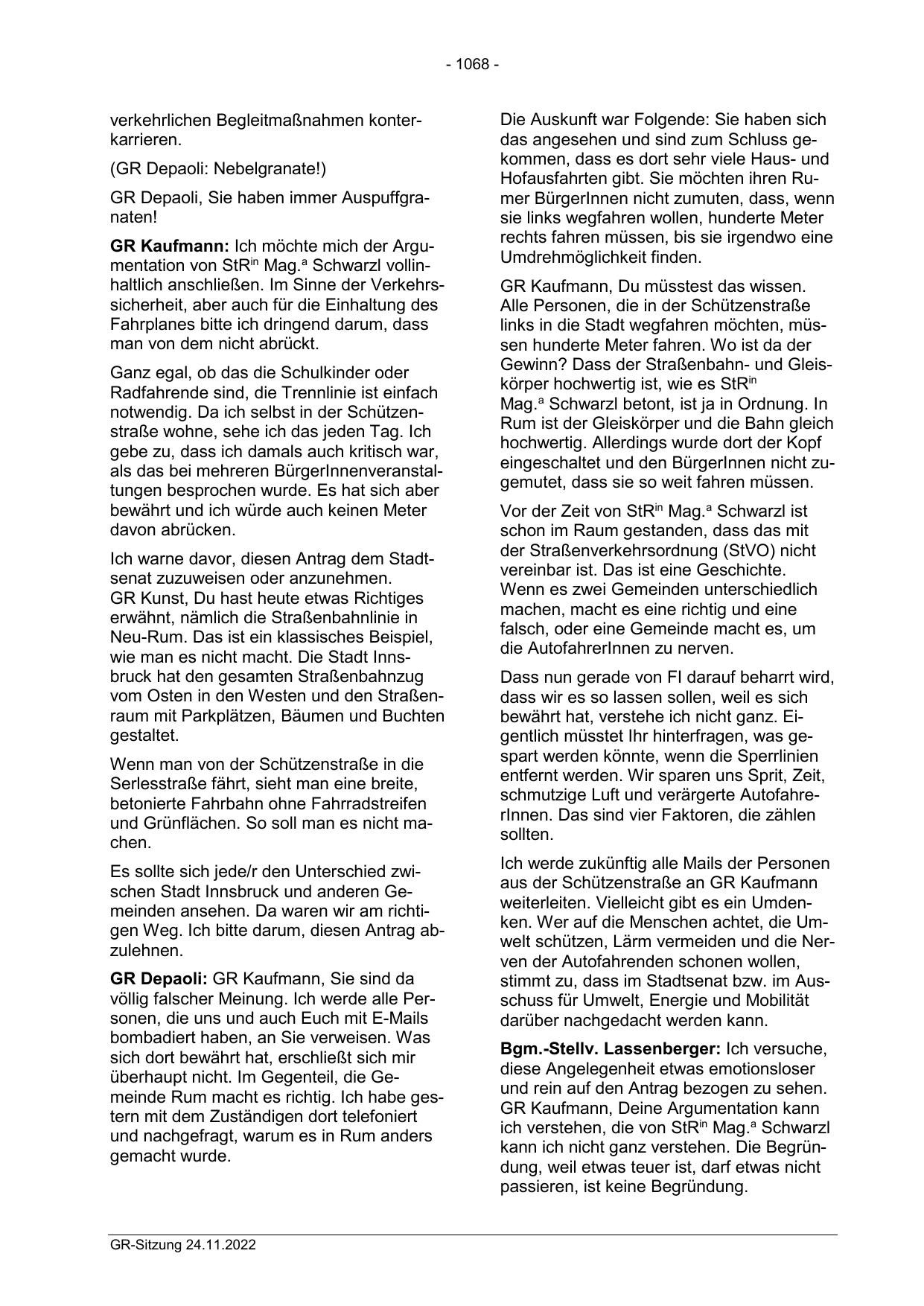 GR Kaufmann: Ich möchte mich der Argumentation von StRin Mag.a Schwarzl vollinhaltlich anschließen. Im Sinne der Verkehrssicherheit, aber auch für die Einhaltung des