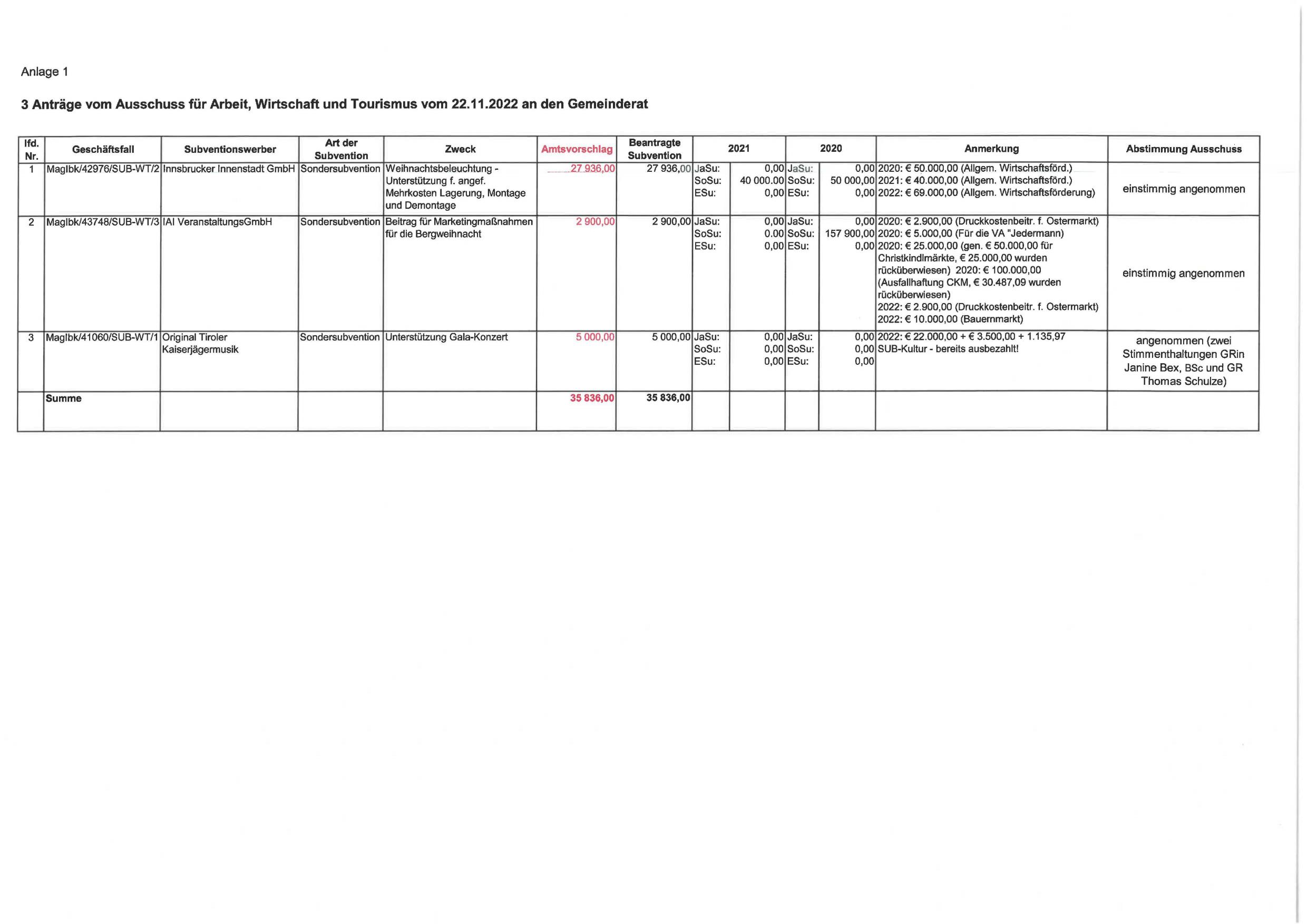 Maglbk/42976/SUB-WT/2 lnnsbrucker Innenstadt GmbH Sondersubvention Weihnachtsbeleuchtung Unterstützung f. angef.