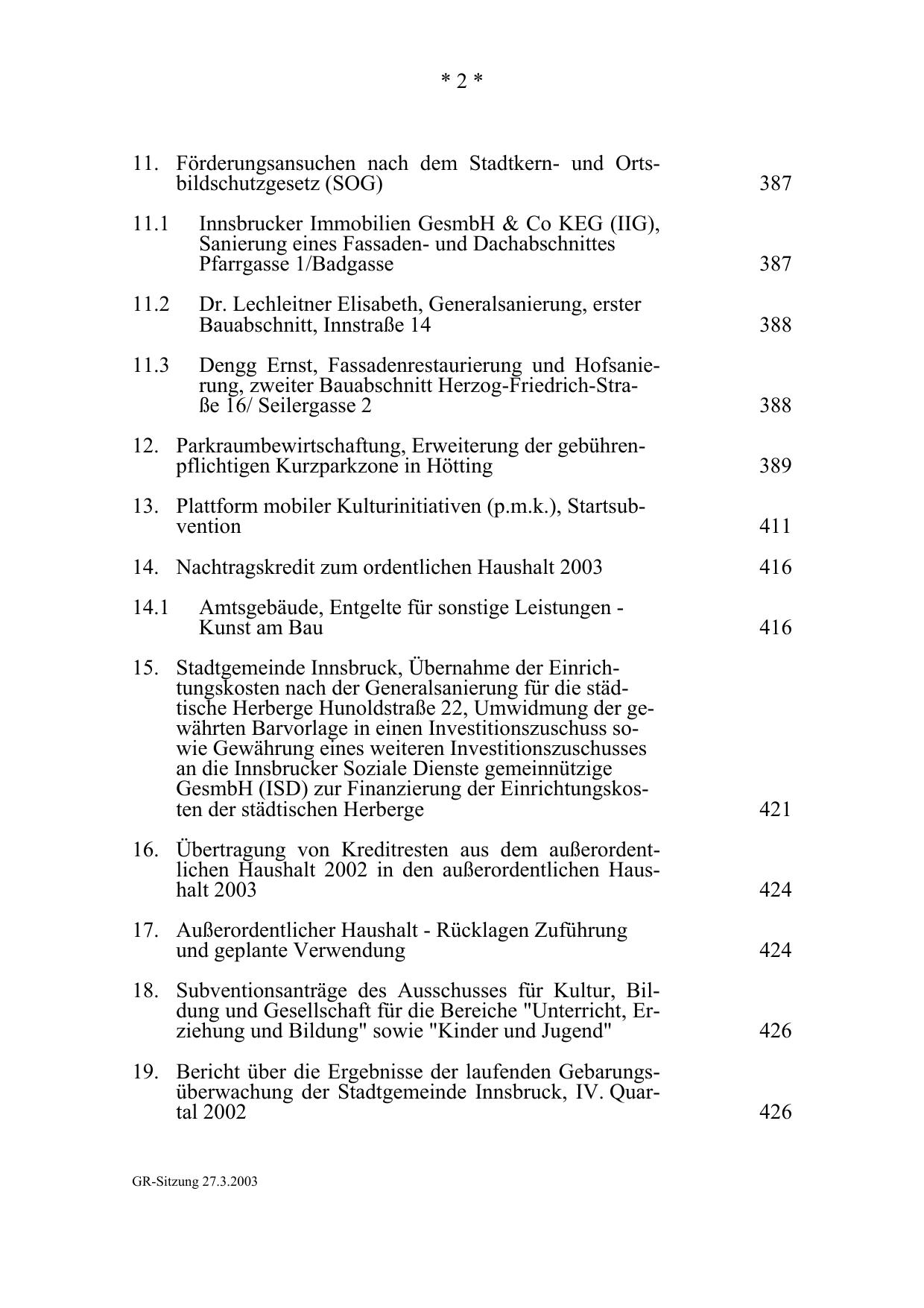 19. Bericht über die Ergebnisse der laufenden Gebarungsüberwachung der Stadtgemeinde Innsbruck, IV. Quartal 2002