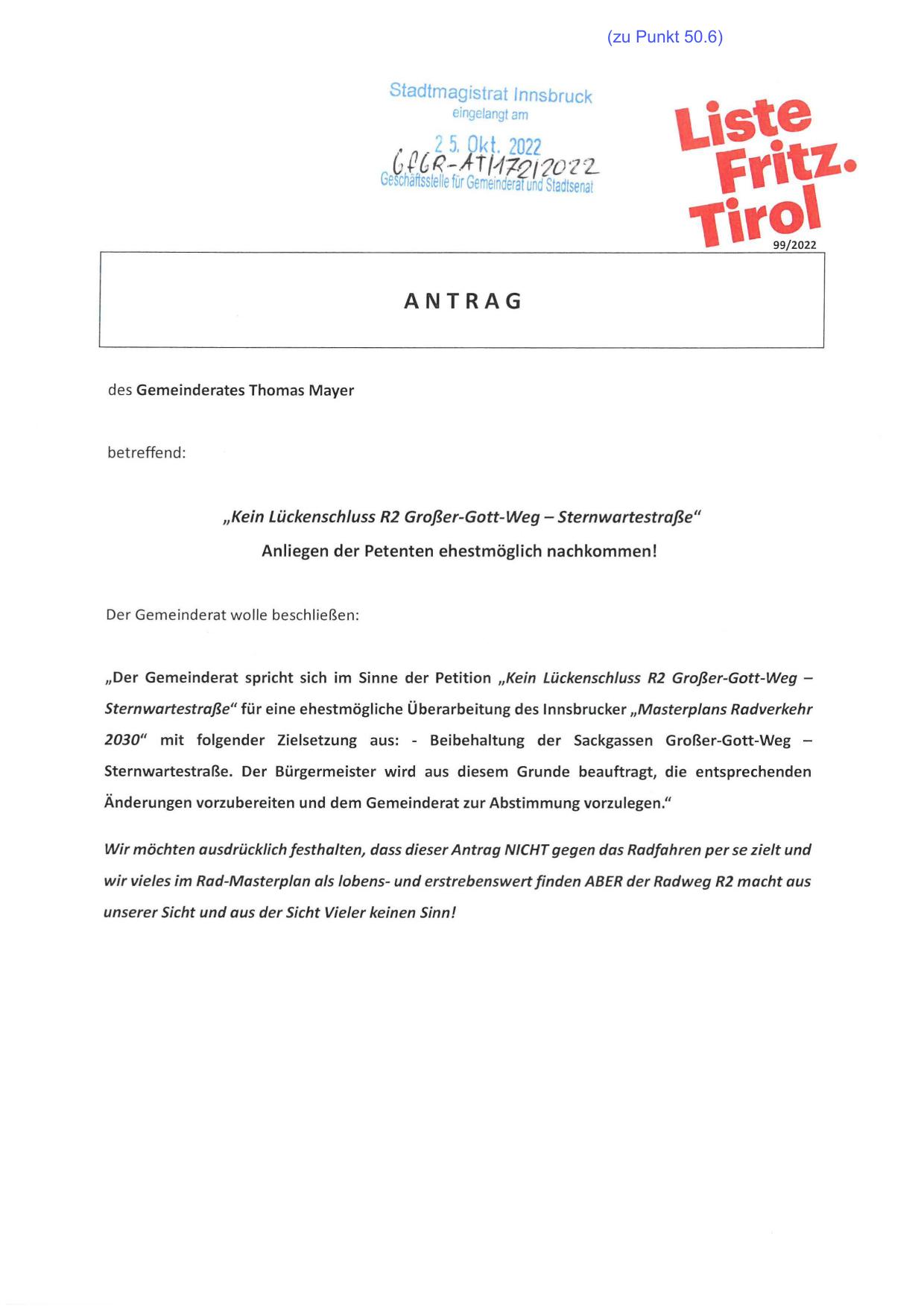 Sternwartestraße" für eine ehestmögliche Überarbeitung des lnnsbrucker „Masterplans Radverkehr