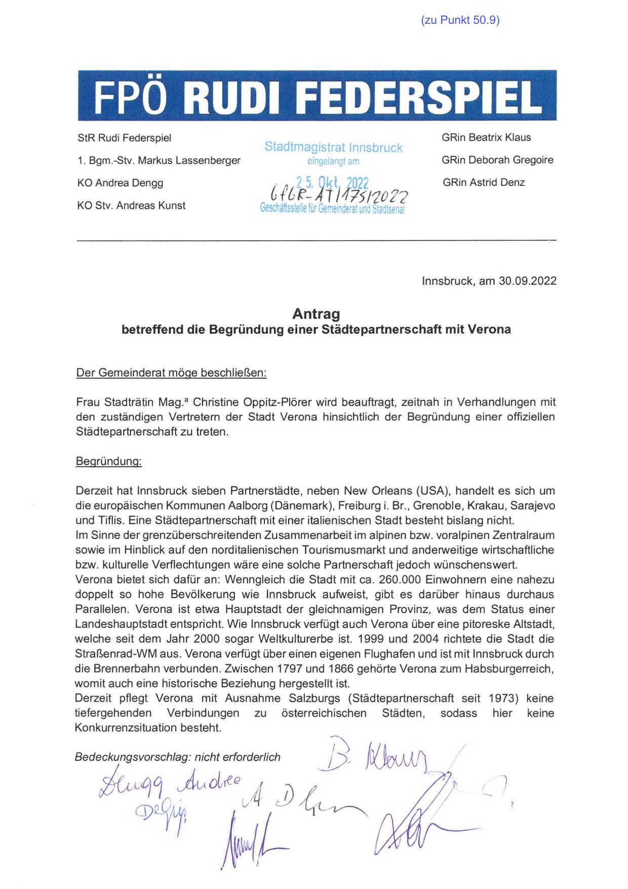 betreffend die Begründung einer Städtepartnerschaft mit Verona