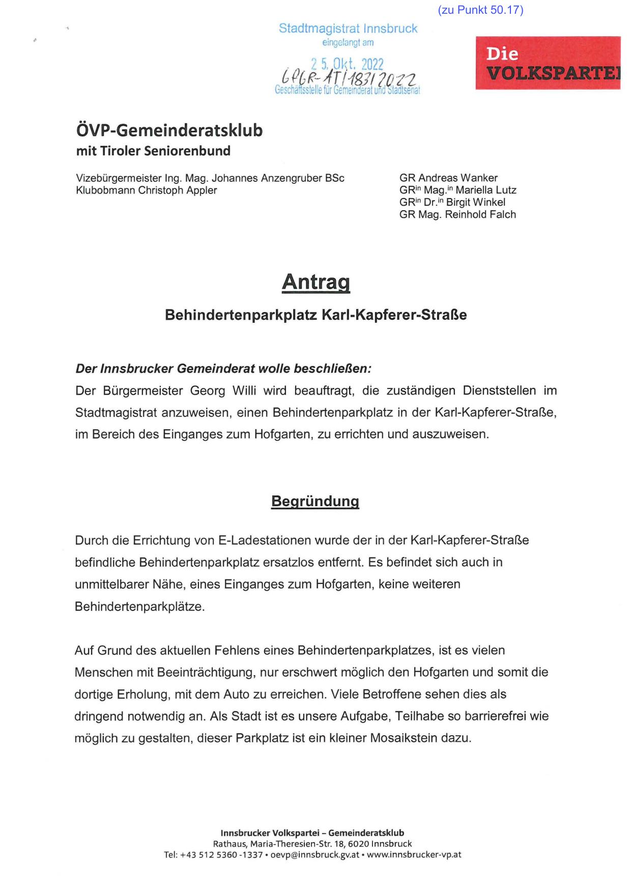 Stadtmagistrat anzuweisen, einen Behindertenparkplatz in der Karl-Kapferer-Straße,
