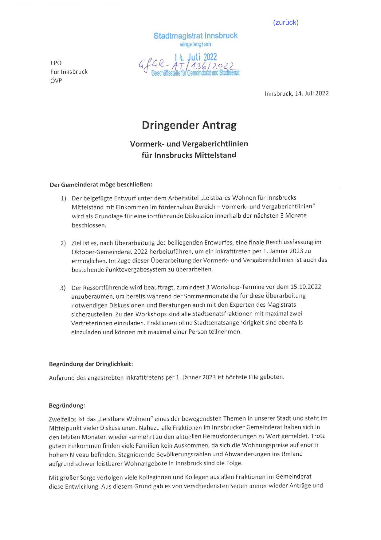 Der beigefügte Entw urf unter dem Arbeitstitel „Leistbares Wohnen für lnnsbrucks