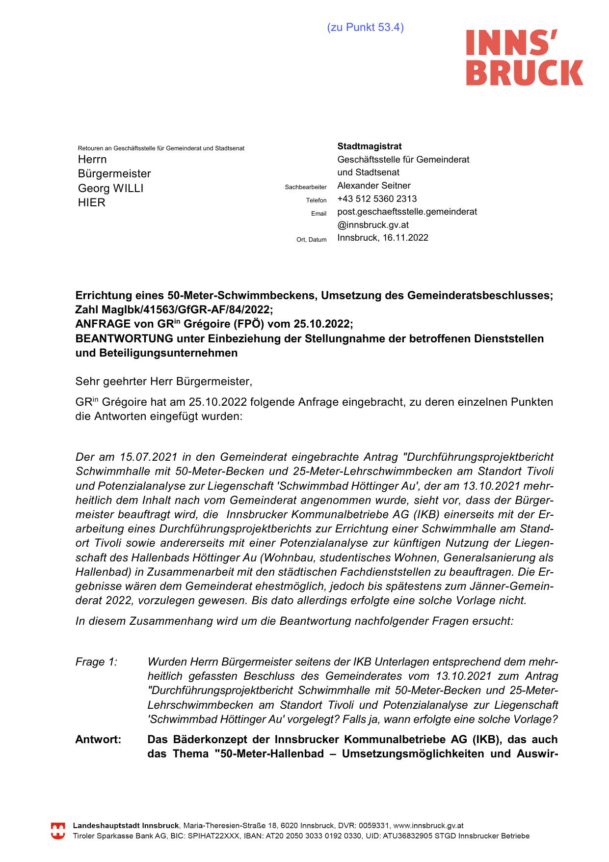 und Potenzialanalyse zur Liegenschaft "Schwimmbad Höttinger Au", der am 13.10.2021 mehrheitlich dem Inhalt nach vom Gemeinderat angenommen wurde, sieht vor, dass der Bürgermeister beauftragt wird, die Innsbrucker Kommunalbetriebe AG (IKB) einerseits mit der Erarbeitung eines Durchführungsprojektberichts zur Errichtung einer Schwimmhalle am Standort Tivoli sowie andererseits mit einer Potenzialanalyse zur künftigen Nutzung der Liegenschaft des Hallenbads Höttinger Au (Wohnbau, studentisches Wohnen, Generalsanierung als