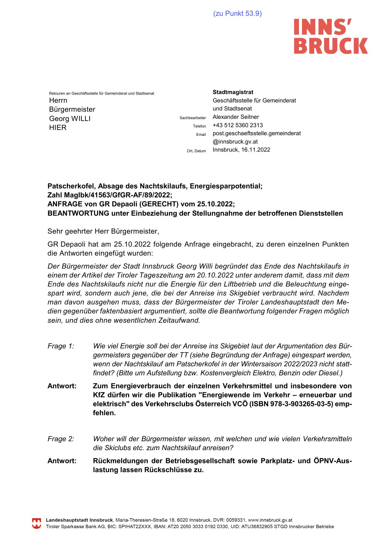 GR Depaoli hat am 25.10.2022 folgende Anfrage eingebracht, zu deren einzelnen Punkten