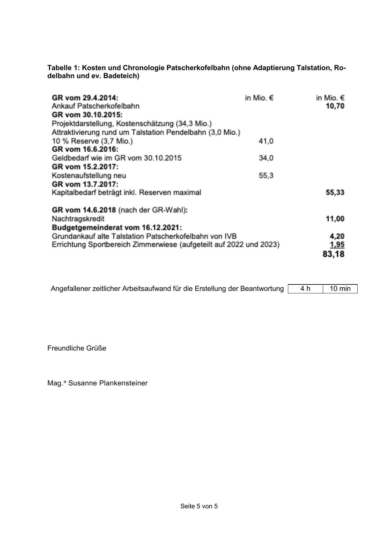 Tabelle 1: Kosten und Chronologie Patscherkofelbahn (ohne Adaptierung Talstation, Rodelbahn und ev. Badeteich)