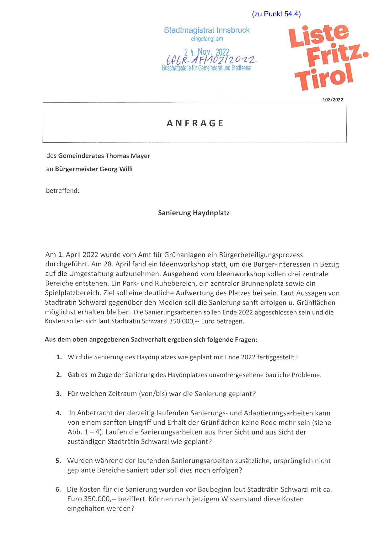 Wird die Sanierung des Haydnplatzes wie geplant mit Ende 2022 fertiggestellt?