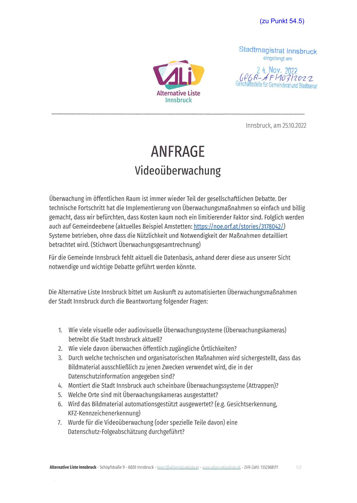 Die Alternative Liste Innsbruck bittet um Auskunft zu automatisierten Überwachungsmaßnahmen
