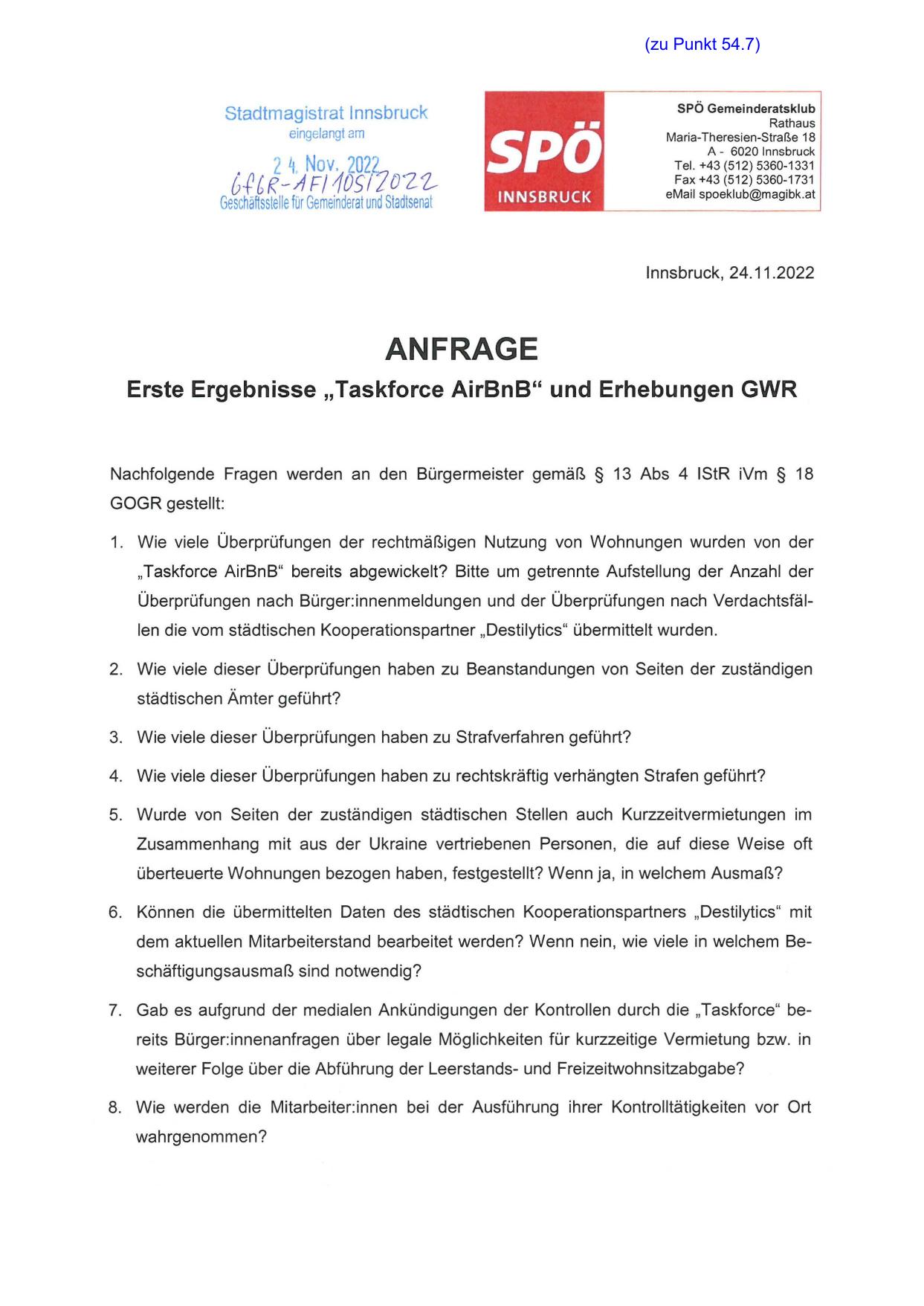 7. Gab es aufgrund der medialen Ankündigungen der Kontrollen durch die „Taskforce" bereits Bürger:innenanfragen über legale Möglichkeiten für kurzzeitige Vermietung bzw. in
