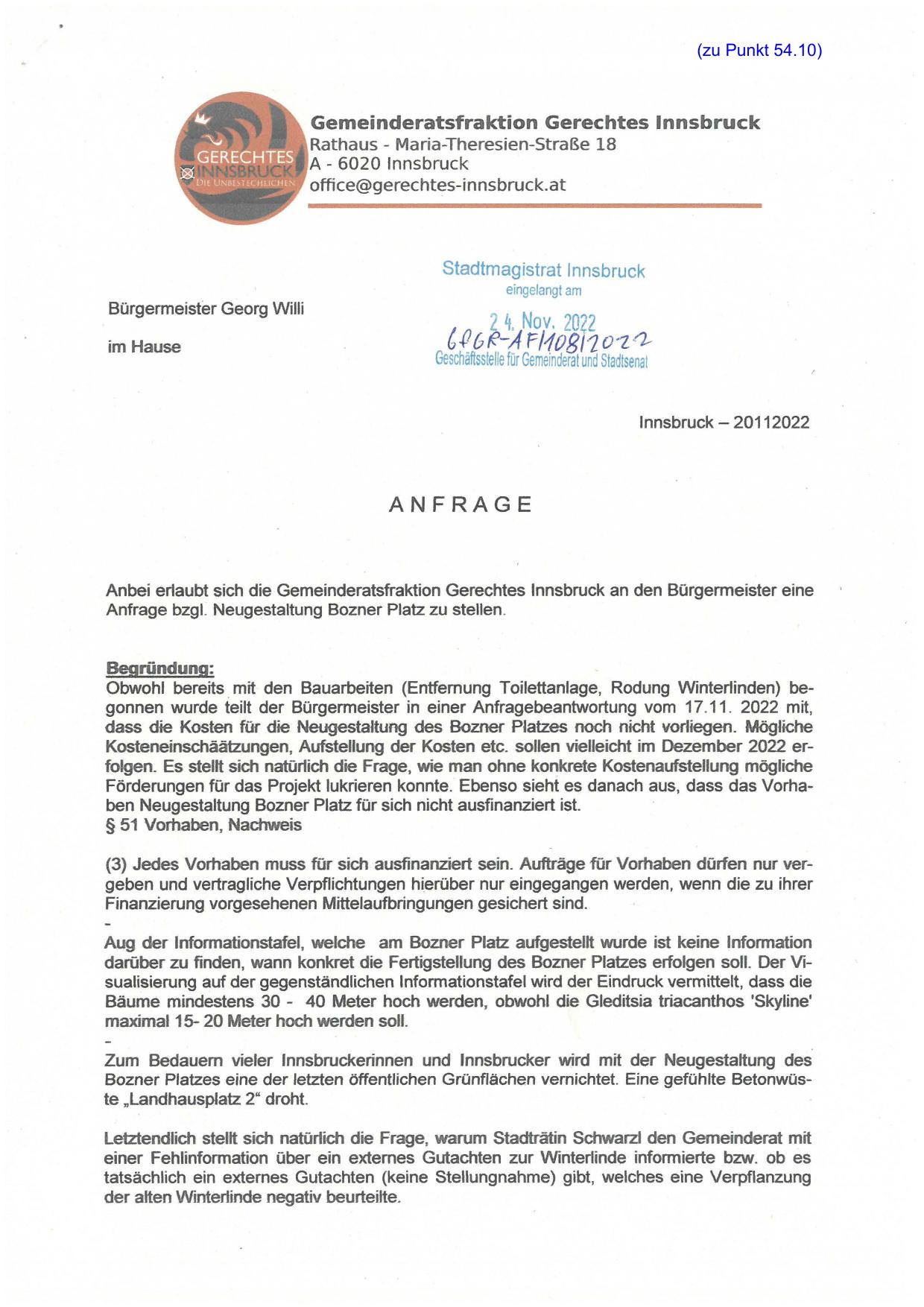 Anbei erlaubt sich die Gemeinderatsfraktion Gerechtes Innsbruck an den Bürgermeister eine