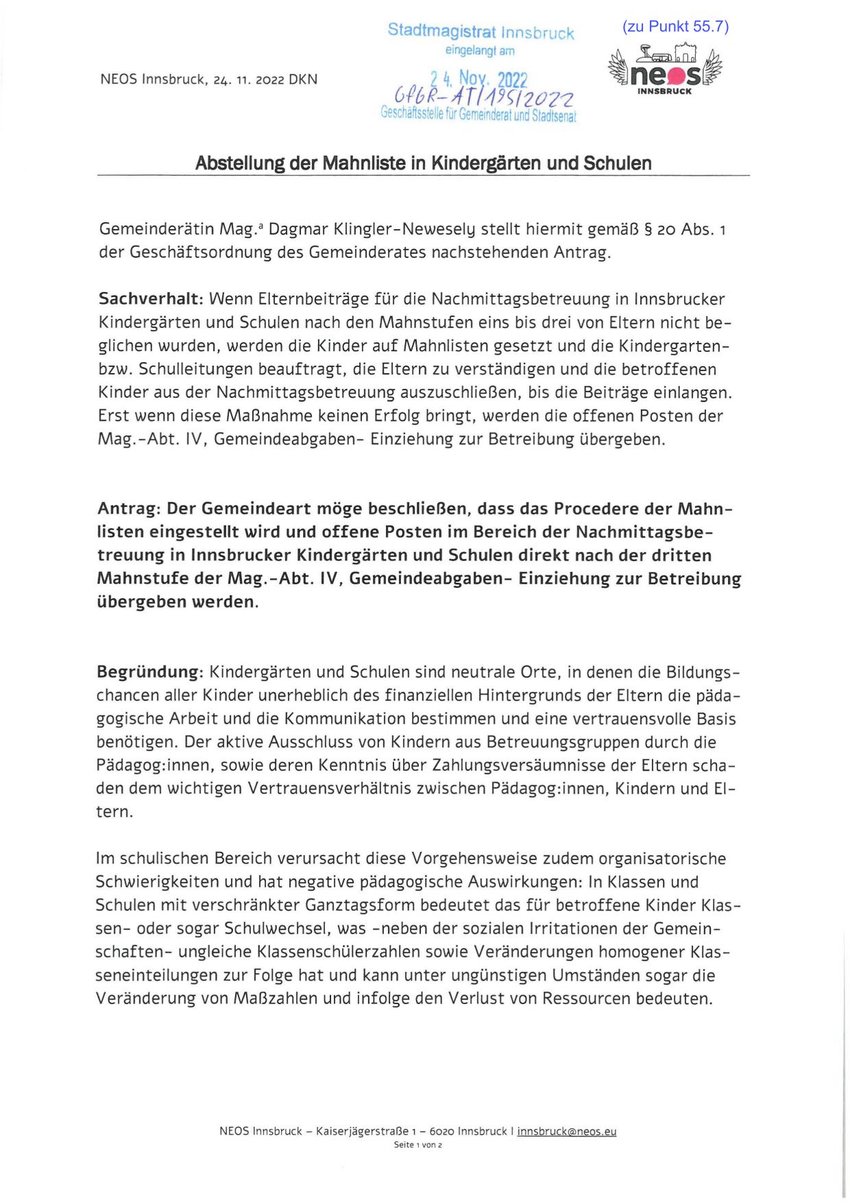 Antrag: Der Gemeindeart möge beschließen, dass das Procedere der Mahnlisten eingestellt wird und offene Posten im Bereich der Nachmittagsbetreuung in lnnsbrucker Kindergärten und Schulen direkt nach der dritten