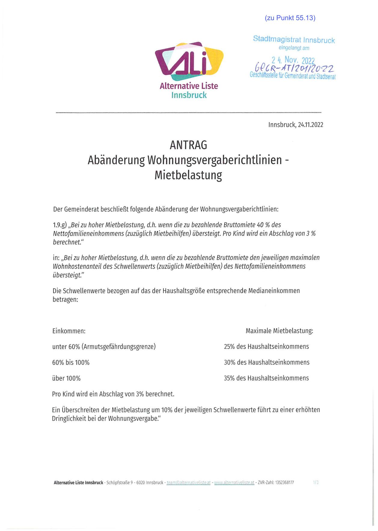 Abänderung Wohnungsvergaberichtlinien Mietbelastung