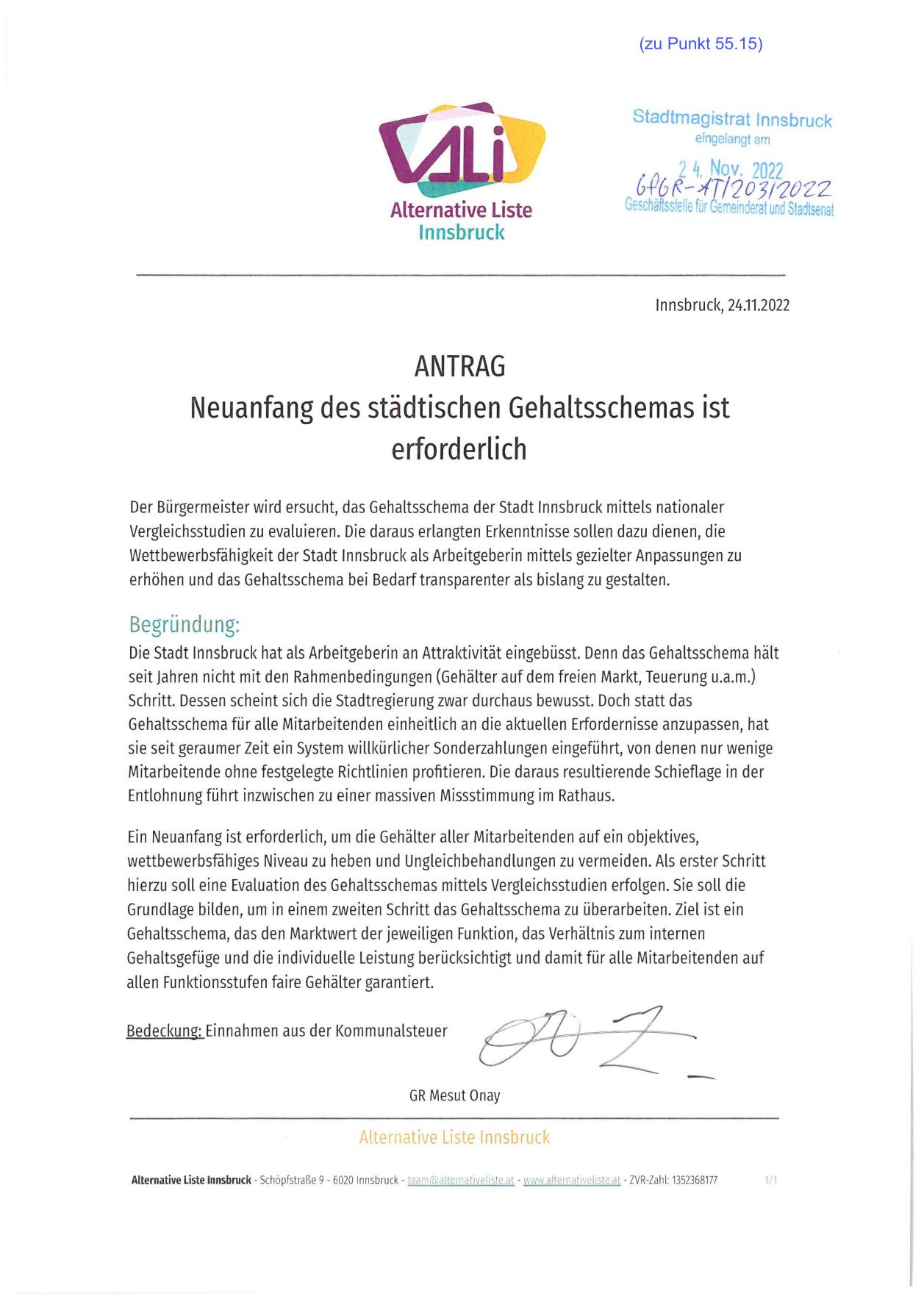 Der Bürgermeister wird ersucht, das Gehaltsschema der Stadt Innsbruck mittels nationaler