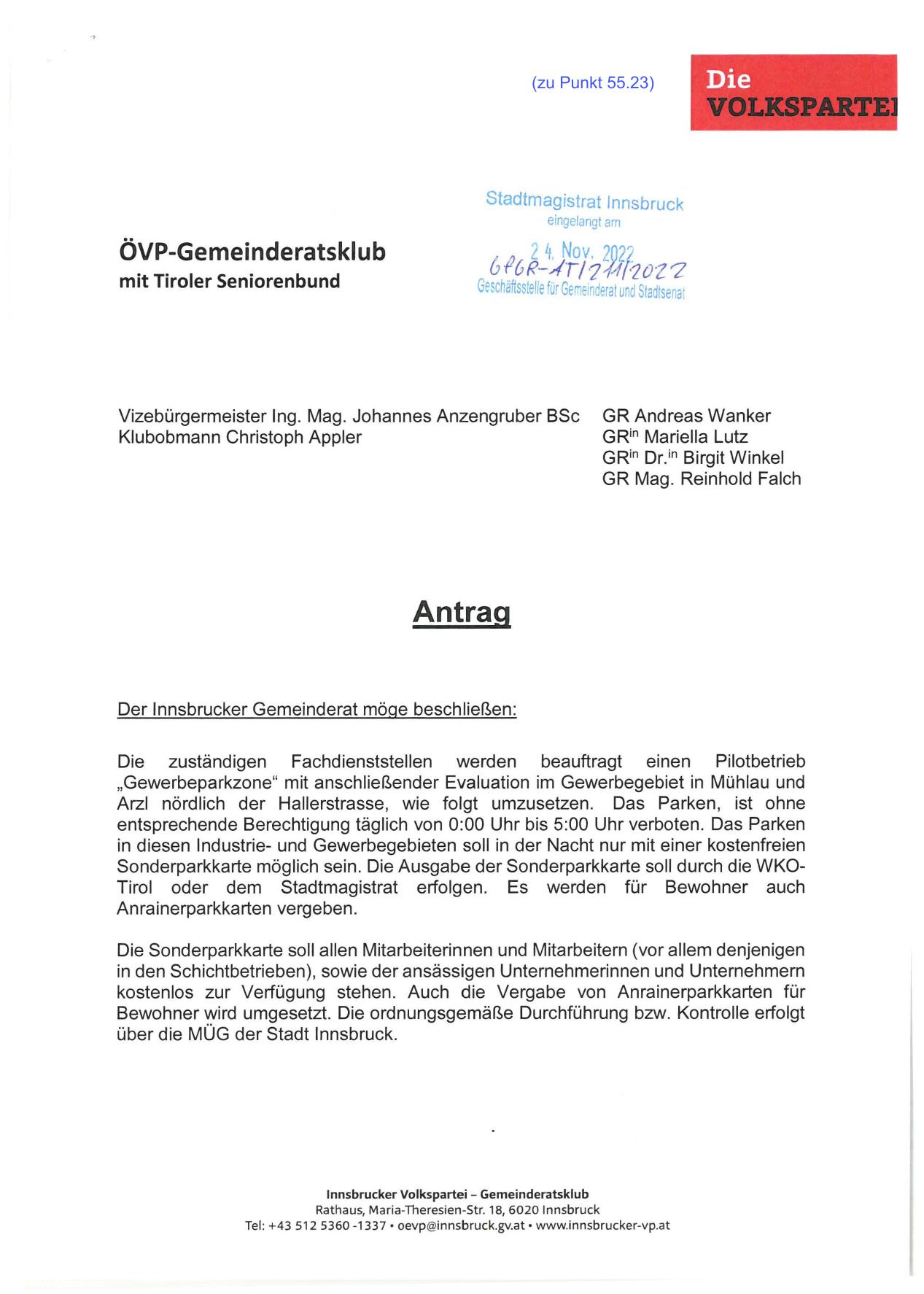 Sonderparkkarte möglich sein. Die Ausgabe der Sonderparkkarte soll durch die WKOTirol oder dem Stadtmagistrat erfolgen. Es werden für Bewohner auch