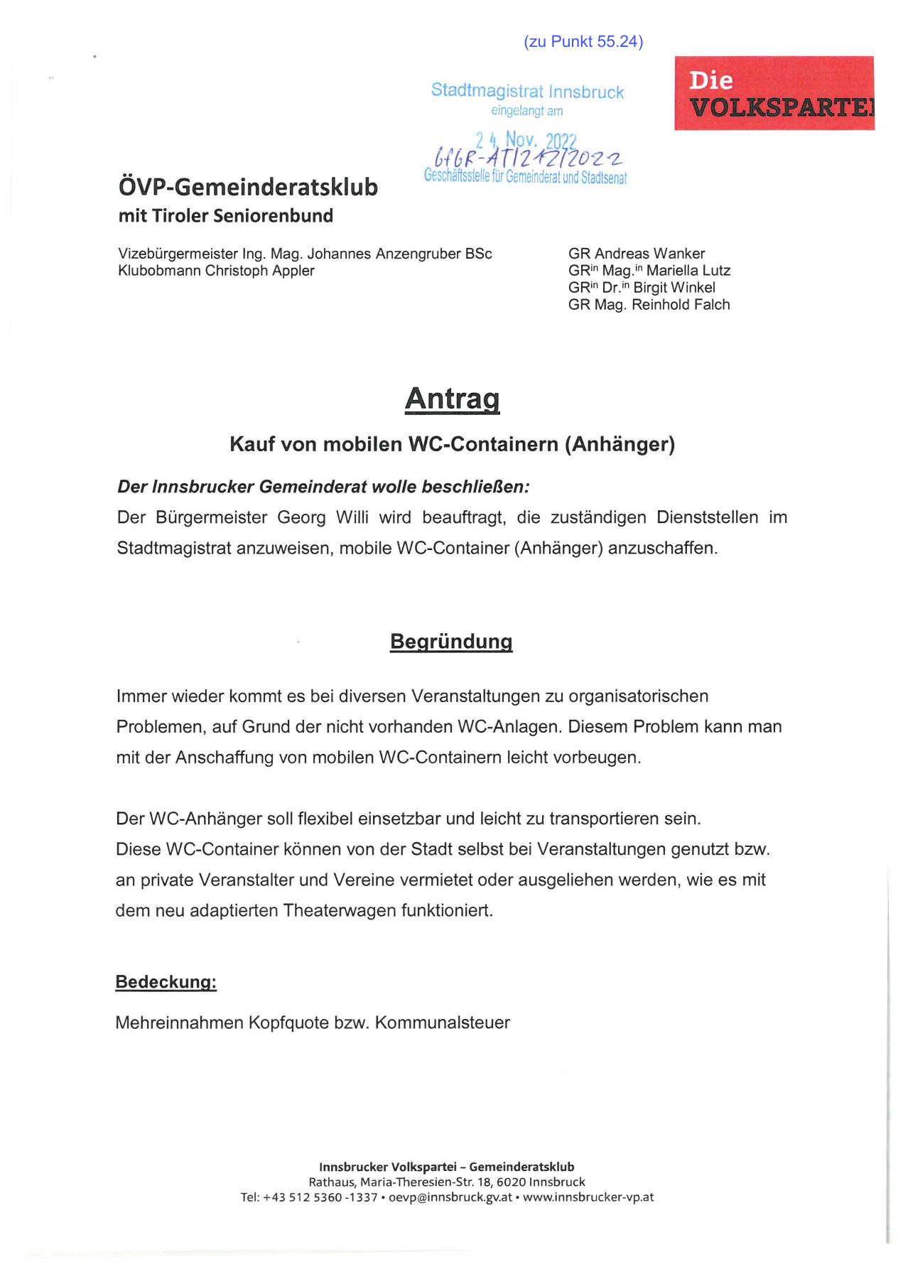 Stadtmagistrat anzuweisen, mobile WC-Container (Anhänger) anzuschaffen.