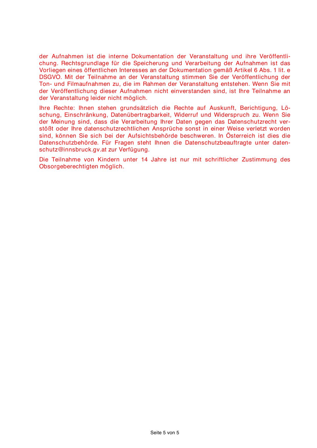 Datenschutzbehörde. Für Fragen steht Ihnen die Datenschutzbeauftragte unter datenschutz@innsbruck.gv.at zur Verfügung.