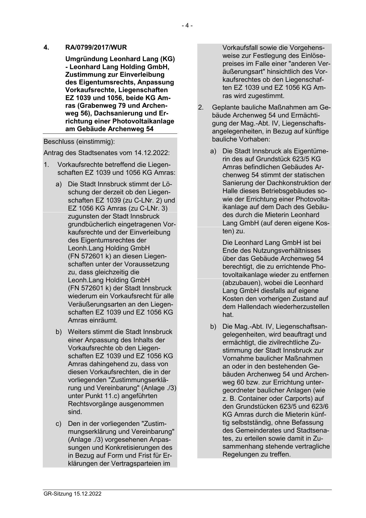Vorkaufsfall sowie die Vorgehensweise zur Festlegung des Einlösepreises im Falle einer "anderen Veräußerungsart" hinsichtlich des Vorkaufsrechtes ob den Liegenschaften EZ 1039 und EZ 1056 KG Amras wird zugestimmt.