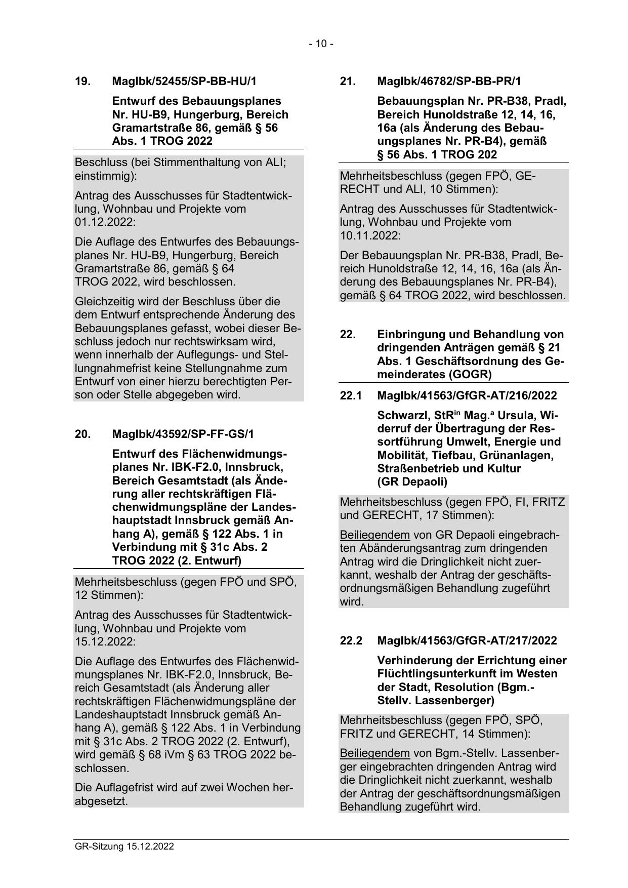 Mehrheitsbeschluss (gegen FPÖ, GERECHT und ALI, 10 Stimmen):