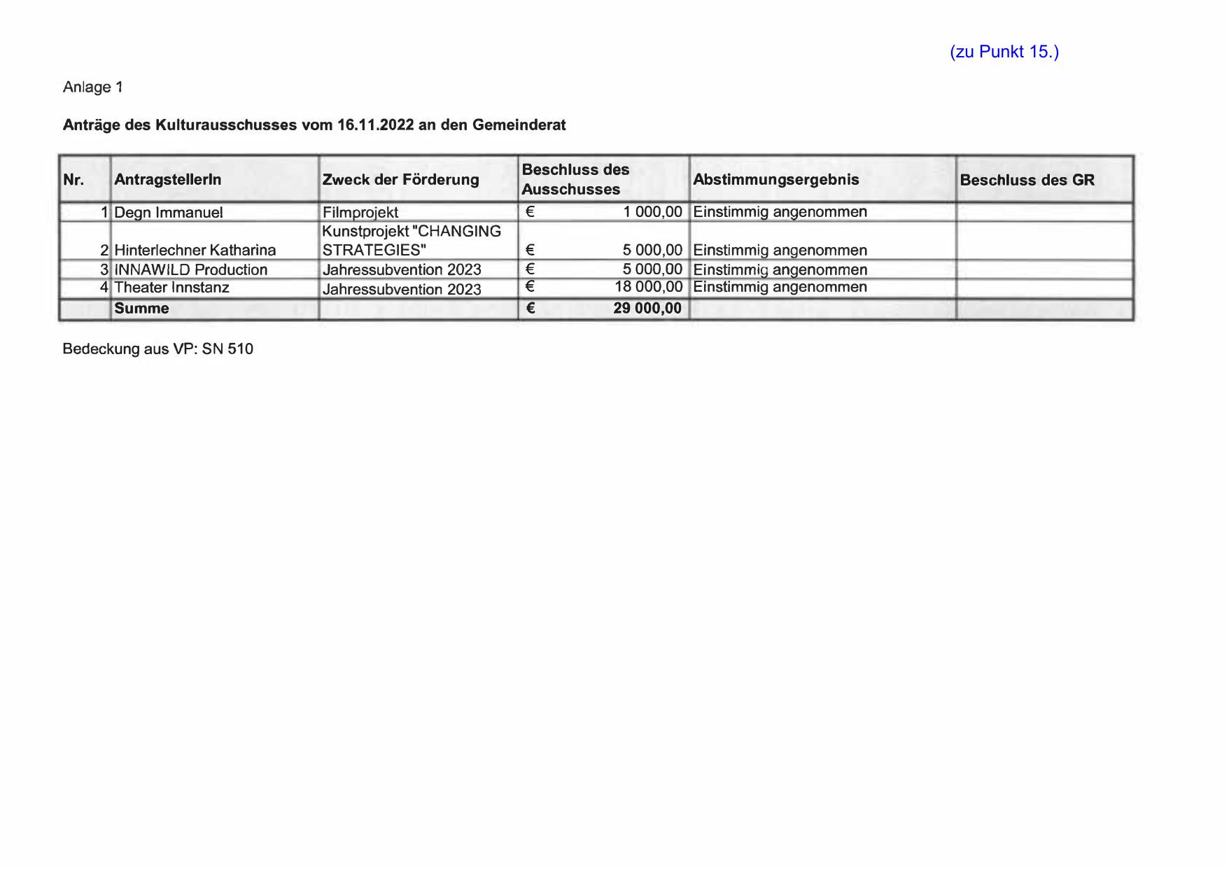Anträge des Kulturausschusses vom 16.11.2022 an den Gemeinderat