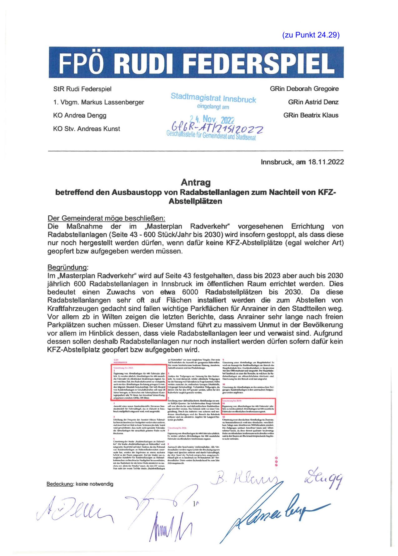 betreffend de n Ausbaustopp von Radabstella nlagen zum Nachteil von KFZ