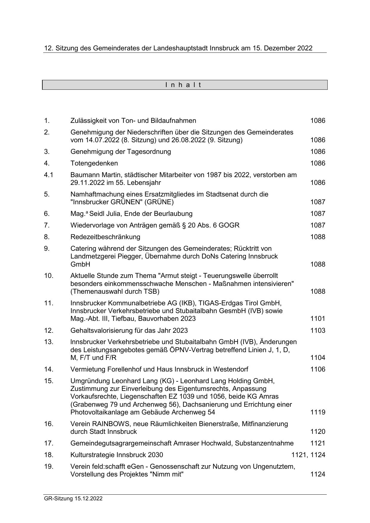 12. Sitzung des Gemeinderates der Landeshauptstadt Innsbruck am 15. Dezember 2022