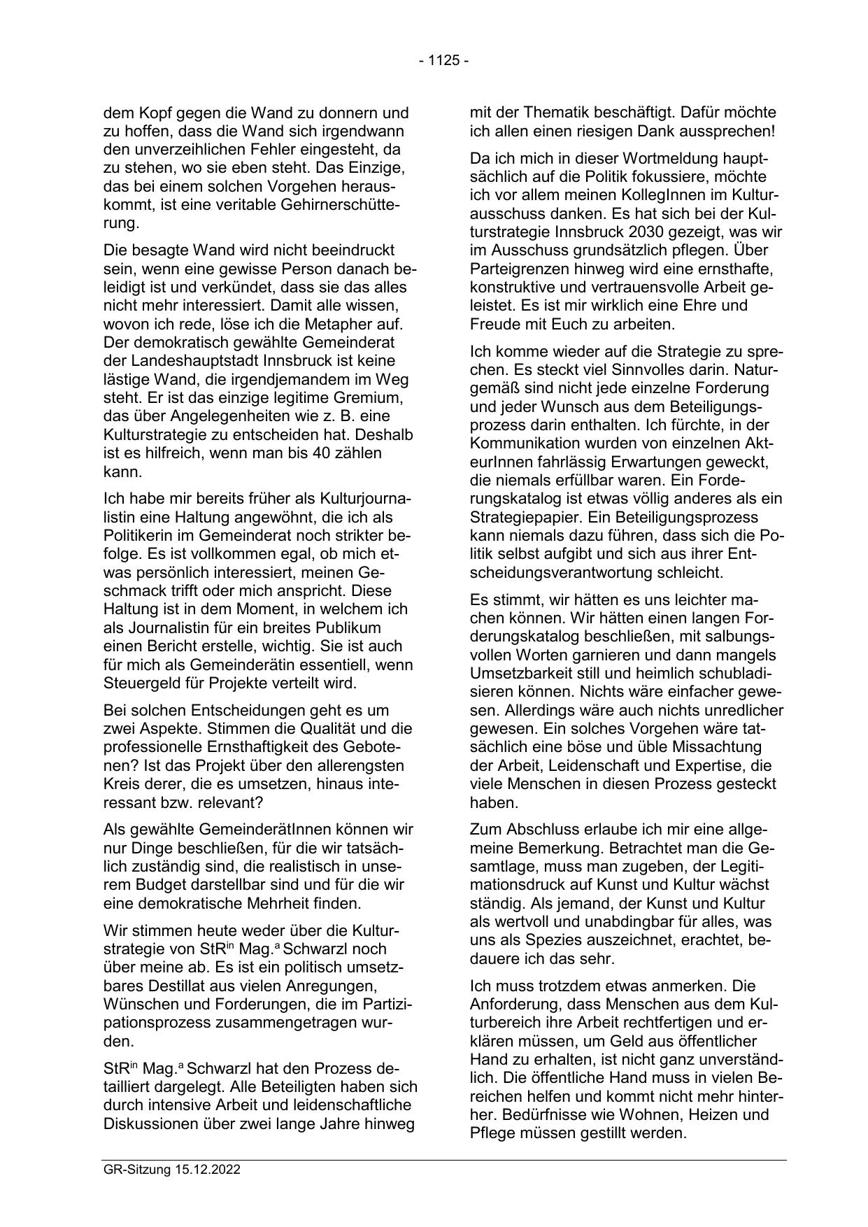 ich vor allem meinen KollegInnen im Kulturausschuss danken. Es hat sich bei der Kulturstrategie Innsbruck 2030 gezeigt, was wir
