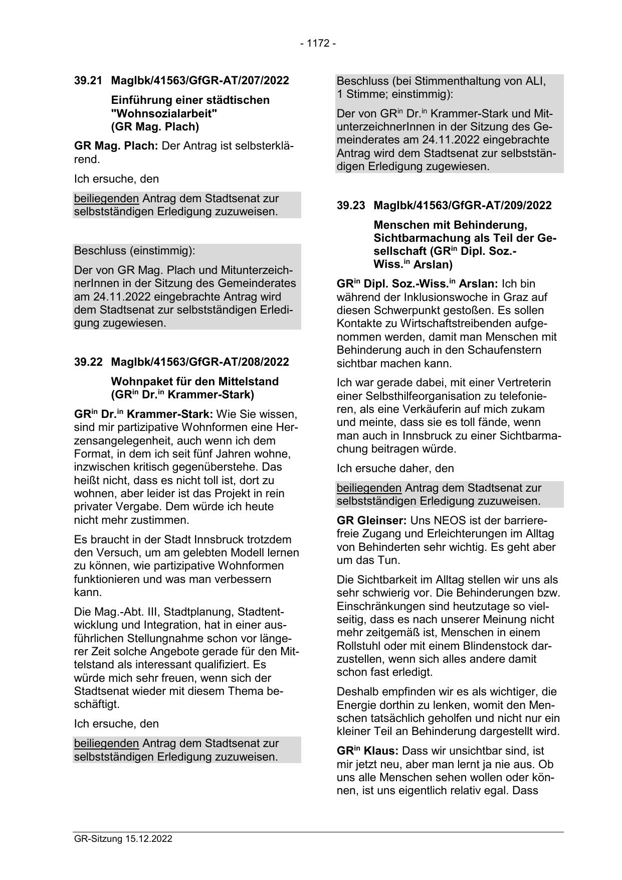 Der von GRin Dr.in Krammer-Stark und MitunterzeichnerInnen in der Sitzung des Gemeinderates am 24.11.2022 eingebrachte
