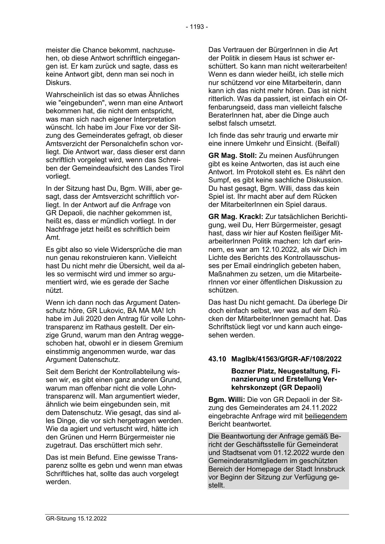 Bgm. Willi: Die von GR Depaoli in der Sitzung des Gemeinderates am 24.11.2022
