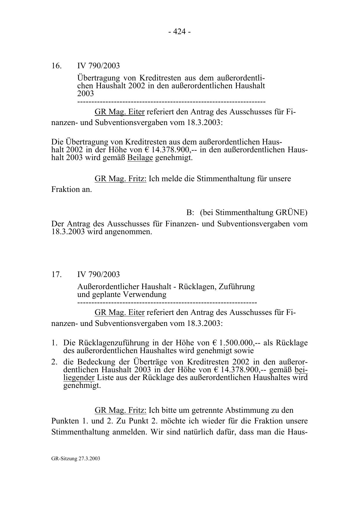 Stimmenthaltung anmelden. Wir sind natürlich dafür, dass man die HausGR-Sitzung 27.3.2003