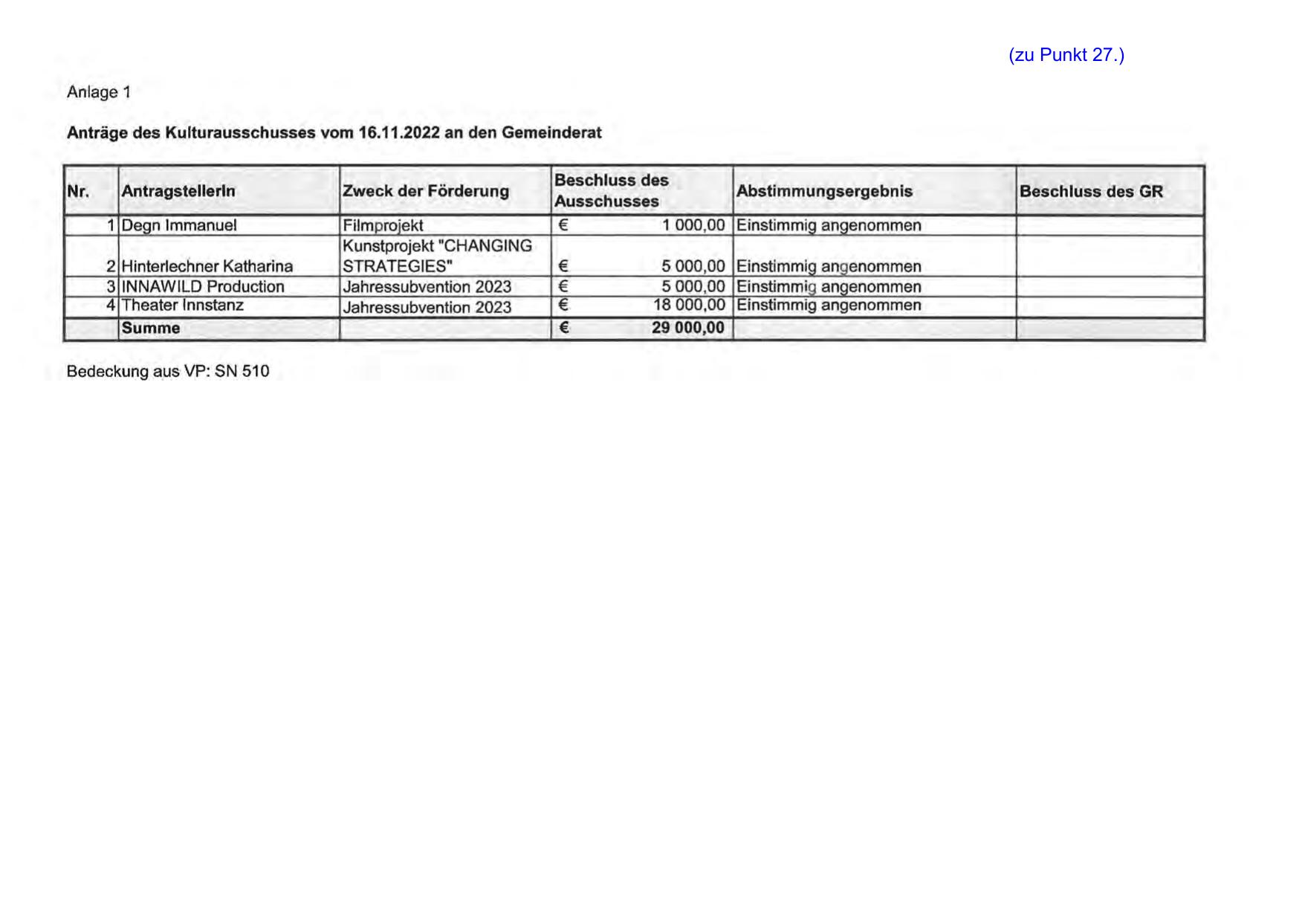 Anträge des Kulturausschusses vom 16.11.2022 an den Gemeinderat