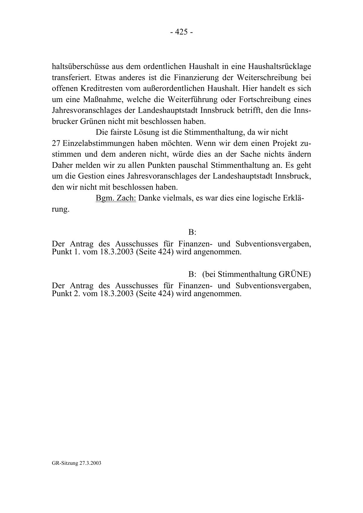 Punkt 2. vom 18.3.2003 (Seite 424) wird angenommen.