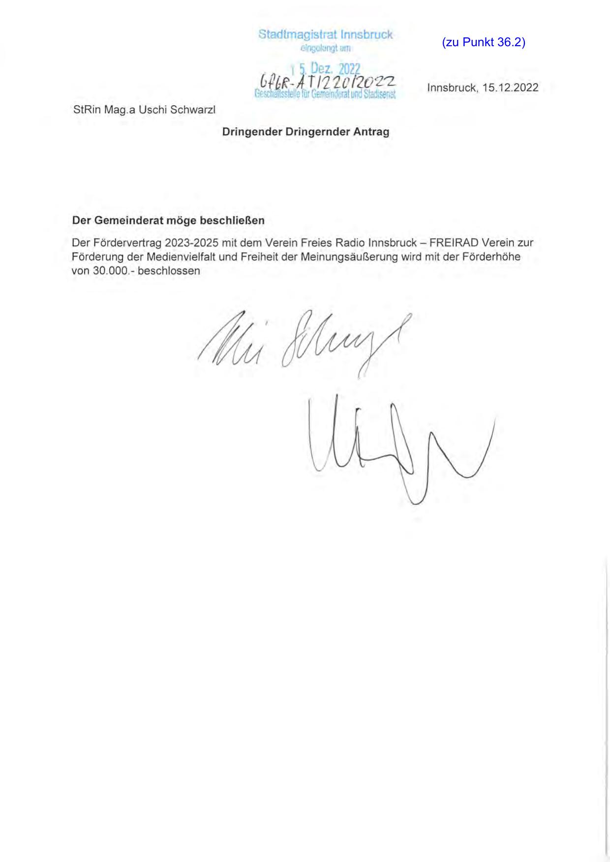 Der Fördervertrag 2023-2025 mit dem Verein Freies Radio Innsbruck - FREI RAD Verein zur
