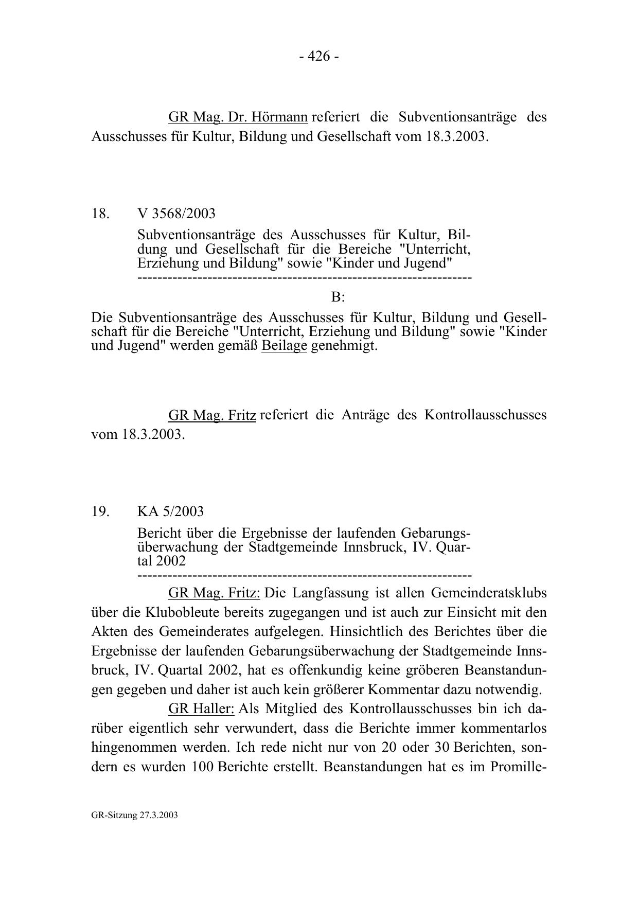 Ergebnisse der laufenden Gebarungsüberwachung der Stadtgemeinde Innsbruck, IV. Quartal 2002, hat es offenkundig keine gröberen Beanstandungen gegeben und daher ist auch kein größerer Kommentar dazu notwendig.