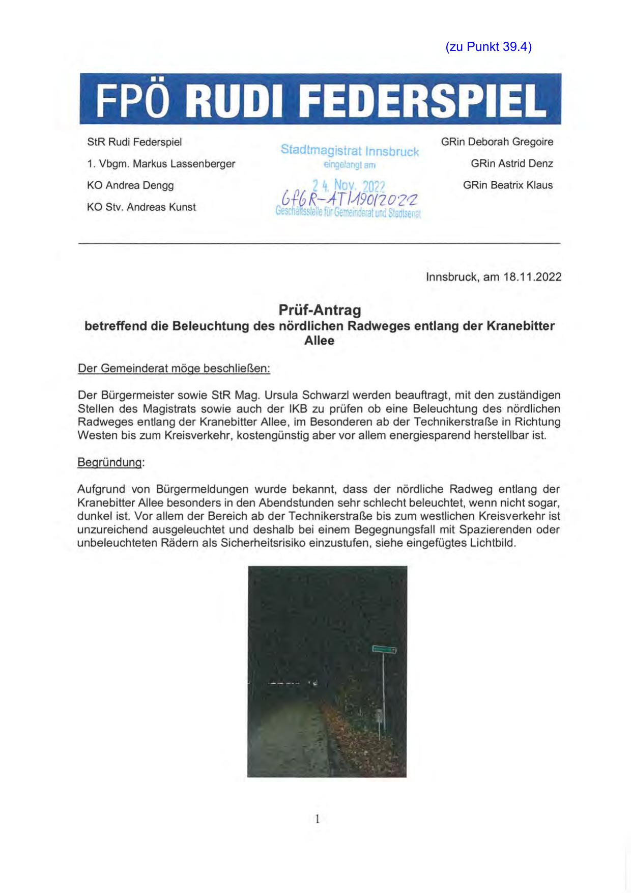 betreffend die Beleuchtung des nördlichen Radweges entlang der Kranebitter