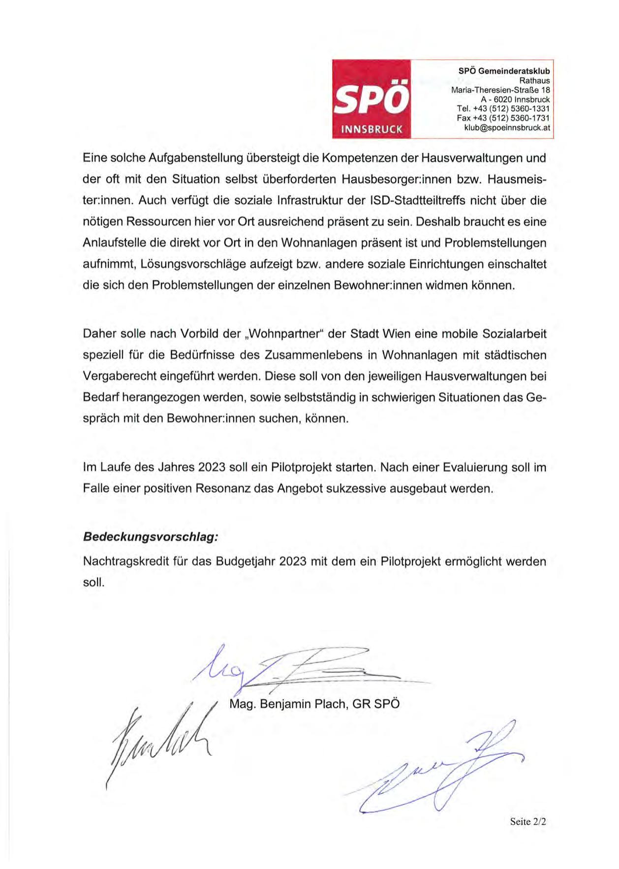 Daher solle nach Vorbild der „Wohnpartner" der Stadt Wien eine mobile Sozialarbeit